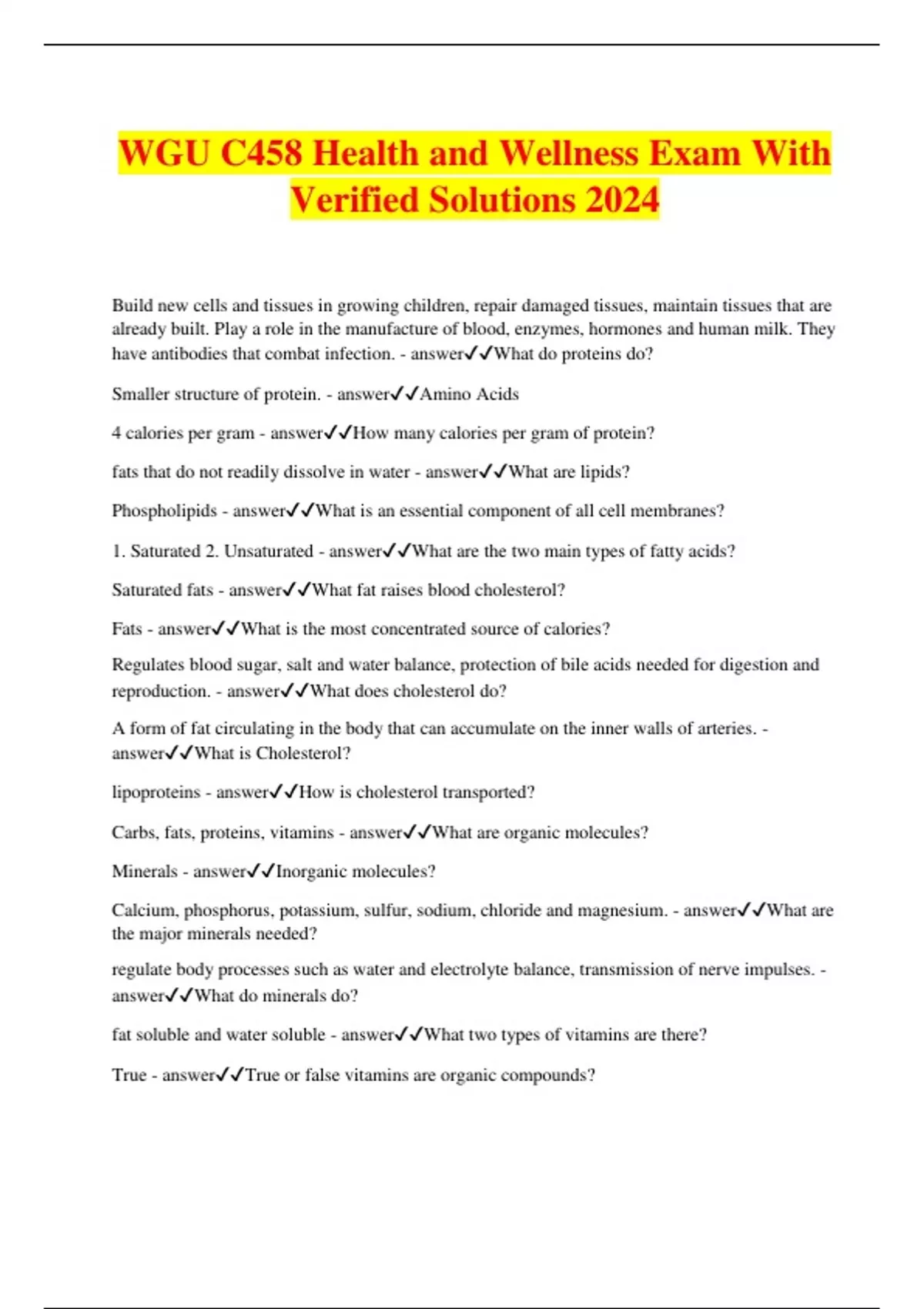 WGU C458 Health and Wellness Exam With Verified Solutions 2024 Build new cells and tissues in growing children, repair damaged tissues, maintain tissues that are already built. Play a role in the manufacture of blood, enzymes, hormones and human milk. They have antibodies that combat infection. - answerWhat do proteins do? Smaller structure of protein. - answerAmino Acids 4 calories per gram - answerHow many calories per gram of protein? fats that do not readily dissolve in water - answerWhat are lipids? Phospholipids - answerWhat is an essential component of all cell membranes? 1. Saturated 2. Unsaturated - answerWhat are the two main types of fatty acids? Saturated fats - answerWhat fat raises blood cholesterol? Fats - answerWhat is the most concentrated source of calories? Regulates blood sugar, salt and water balance, protection of bile acids needed for digestion and reproduction. - answerWhat does cholesterol do? A form of fat circulating in the body that can accumulate on the inner walls of arteries. - answerWhat is Cholesterol? lipoproteins - answerHow is cholesterol transported? Carbs, fats, proteins, vitamins - answerWhat are organic molecules? Minerals - answerInorganic molecules? Calcium, phosphorus, potassium, sulfur, sodium, chloride and magnesium. - answerWhat are the major minerals needed? regulate body processes such as water and electrolyte balance, transmission of nerve impulses. - answerWhat do minerals do? fat soluble and water soluble - answerWhat two types of vitamins are there? True - answerTrue or false vitamins are organic compounds?