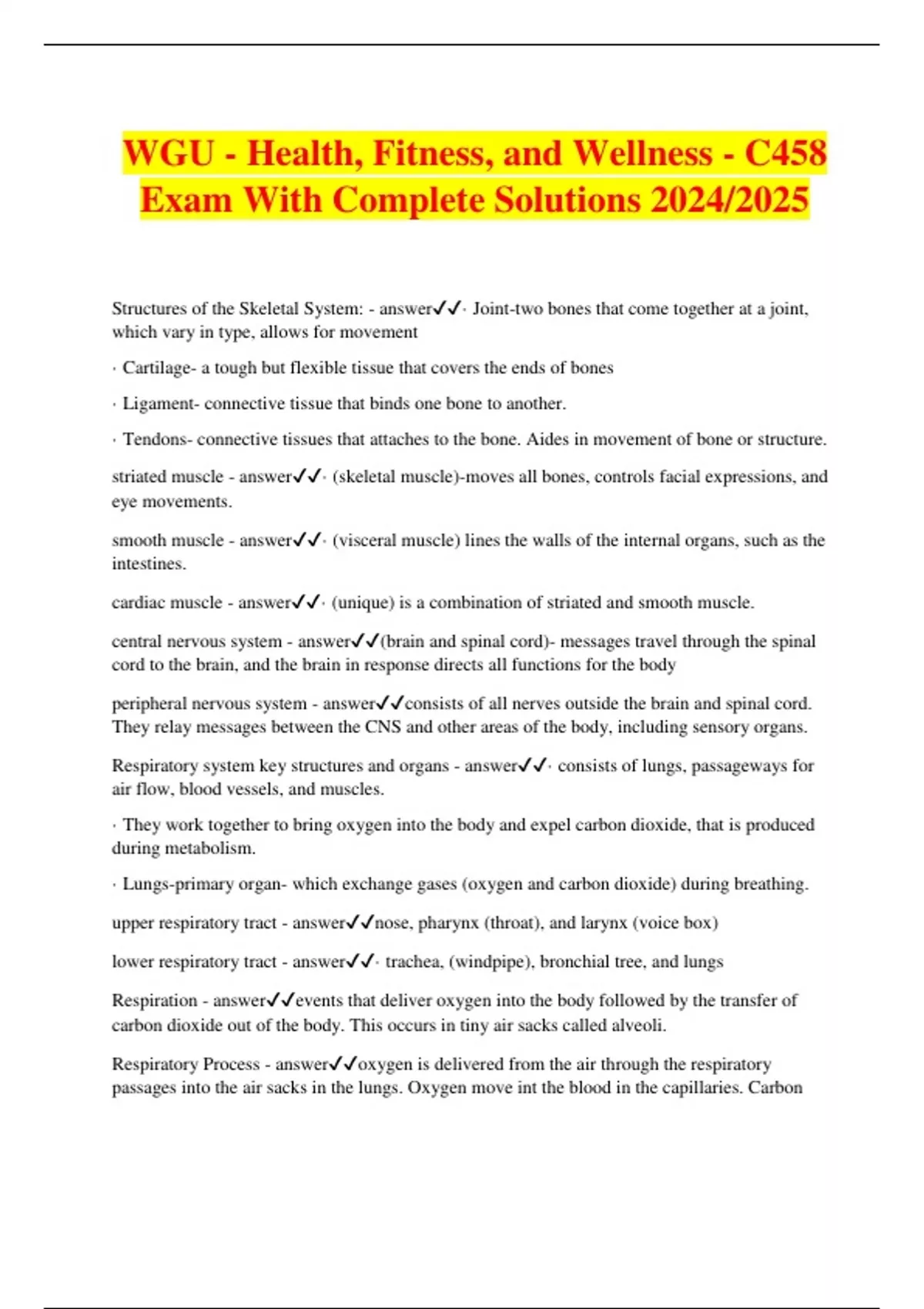 WGU - Health, Fitness, and Wellness - C458 Exam With Complete Solutions 2024/2025 Structures of the Skeletal System: - answer· Joint-two bones that come together at a joint, which vary in type, allows for movement · Cartilage- a tough but flexible tissue that covers the ends of bones · Ligament- connective tissue that binds one bone to another. · Tendons- connective tissues that attaches to the bone. Aides in movement of bone or structure. striated muscle - answer· (skeletal muscle)-moves all bones, controls facial expressions, and eye movements. smooth muscle - answer· (visceral muscle) lines the walls of the internal organs, such as the intestines. cardiac muscle - answer· (unique) is a combination of striated and smooth muscle. central nervous system - answer(brain and spinal cord)- messages travel through the spinal cord to the brain, and the brain in response directs all functions for the body peripheral nervous system - answerconsists of all nerves outside the brain and spinal cord. They relay messages between the CNS and other areas of the body, including sensory organs. Respiratory system key structures and organs - answer· consists of lungs, passageways for air flow, blood vessels, and muscles. · They work together to bring oxygen into the body and expel carbon dioxide, that is produced during metabolism. · Lungs-primary organ- which exchange gases (oxygen and carbon dioxide) during breathing. upper respiratory tract - answernose, pharynx (throat), and larynx (voice box) lower respiratory tract - answer· trachea, (windpipe), bronchial tree, and lungs Respiration - answerevents that deliver oxygen into the body followed by the transfer of carbon dioxide out of the body. This occurs in tiny air sacks called alveoli. Respiratory Process - answeroxygen is delivered from the air through the respiratory passages into the air sacks in the lungs. Oxygen move int the blood in the capillaries. Carbon dioxide moves from blood to air sacks through respiratory passages and is expelled through mouth or nose. cardiovascular system - answerconsists of heart and blood vessels; The heart is a pump that has four chambers: two upper chambers and two lower chambers; Two categories of blood vessels- arteries and veins; Arteries- carry blood away from the heart to the body tissues; Veins- carry oxygen-poor blood back to the heart; ARTERY BLOOD VESSELS- muscles on left of heart pump take blood out of the heart through the AORTA (largest artery) circulation - answerprovides supply of nutrients and oxygen to the body's cells through the flow of blood. digestive systems function - answerFour functions-ingestion, digestion, absorption, and elimination digestive system organs - answerMouth-food broken down by teeth and saliva Esophagus- tube 9-10 inches long connected to stomach Stomach-helps digest food, by mixing it with digestive juices and churning it into a thin liquid Small intestine- absorbs nutrients into the bloodstream Large Intestine-Undigested food and fluids that exit small intestine, creates stool Anus- stool is eliminated after it passes from large intestine into the rectum Accessory organs-salivary glands, liver, gallbladder, and pancreas urinary system function - answerBalance's fluids in body by stimulating thirst and producing, storing, and eliminating urine. urinary system organs - answer1) Kidney- filters waste products (urea, uric, acid) from bloodstream and removes the products in form of urine so that they don't become wasteful to body. It also reabsorbs fluids and other substances back to the bloodstream, so body doesn't lose too much water and essential salts. 2) Ureter-connected to kidneys, urine flows out of kidney through ureter 3) Bladder-holding reservoir for urine 4) Urethra- when urine start to flow it travels through it and expelled from body. Female (1-2 in) Male (8 in.) immune system - answer(lymphatic system) is a complex network of cells, tissues, and organs that work together to defend and protect the body against foreign invaders that can cause sickness and disease. white blood cells (leukocytes) - answerit's job is to find and destroy bacteria, viruses, parasites, fungi, and substances that appear foreign and harmful.