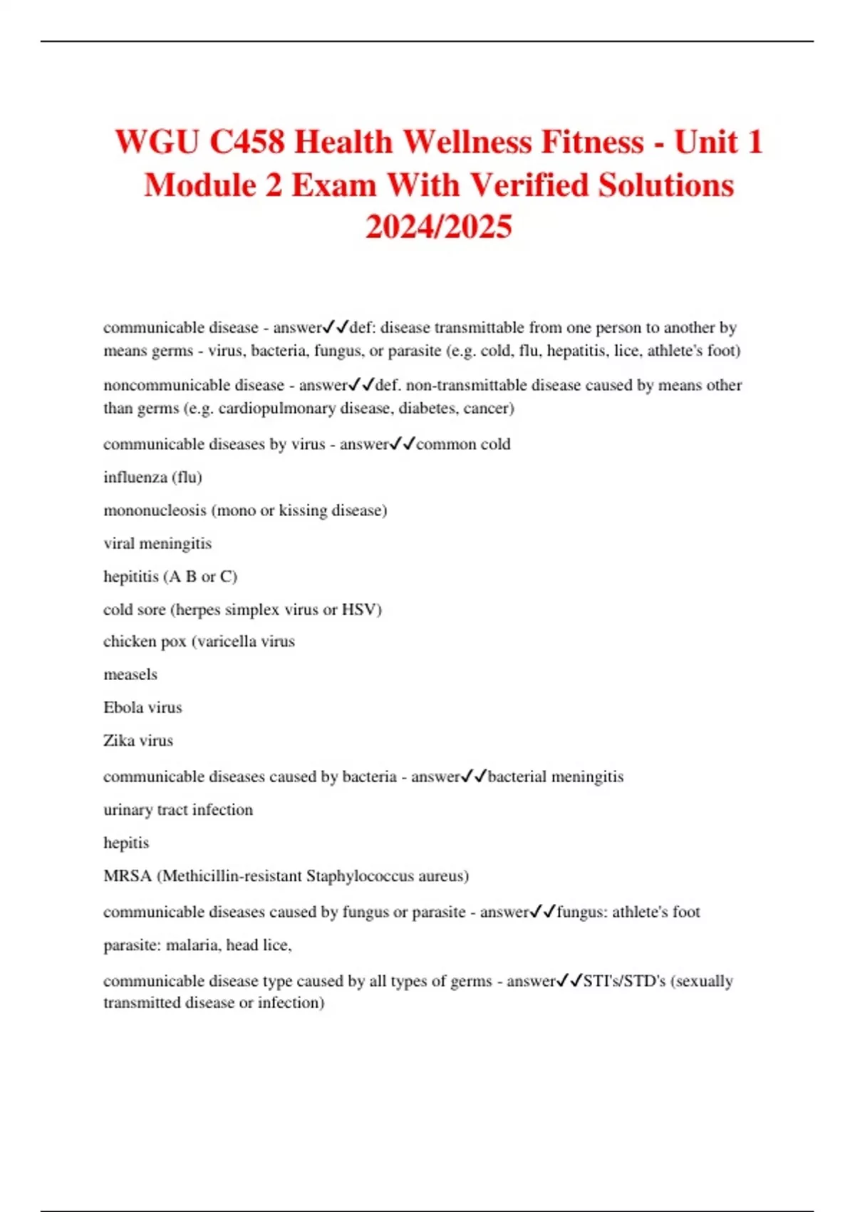 WGU C458 Health Wellness Fitness - Unit 1 Module 2 Exam With Verified Solutions 2024/2025 communicable disease - answerdef: disease transmittable from one person to another by means germs - virus, bacteria, fungus, or parasite (e.g. cold, flu, hepatitis, lice, athlete's foot) noncommunicable disease - answerdef. non-transmittable disease caused by means other than germs (e.g. cardiopulmonary disease, diabetes, cancer) communicable diseases by virus - answercommon cold influenza (flu) mononucleosis (mono or kissing disease) viral meningitis hepititis (A B or C) cold sore (herpes simplex virus or HSV) chicken pox (varicella virus measels Ebola virus Zika virus communicable diseases caused by bacteria - answerbacterial meningitis urinary tract infection hepitis MRSA (Methicillin-resistant Staphylococcus aureus) communicable diseases caused by fungus or parasite - answerfungus: athlete's foot parasite: malaria, head lice, communicable disease type caused by all types of germs - answerSTI's/STD's (sexually transmitted disease or infection)