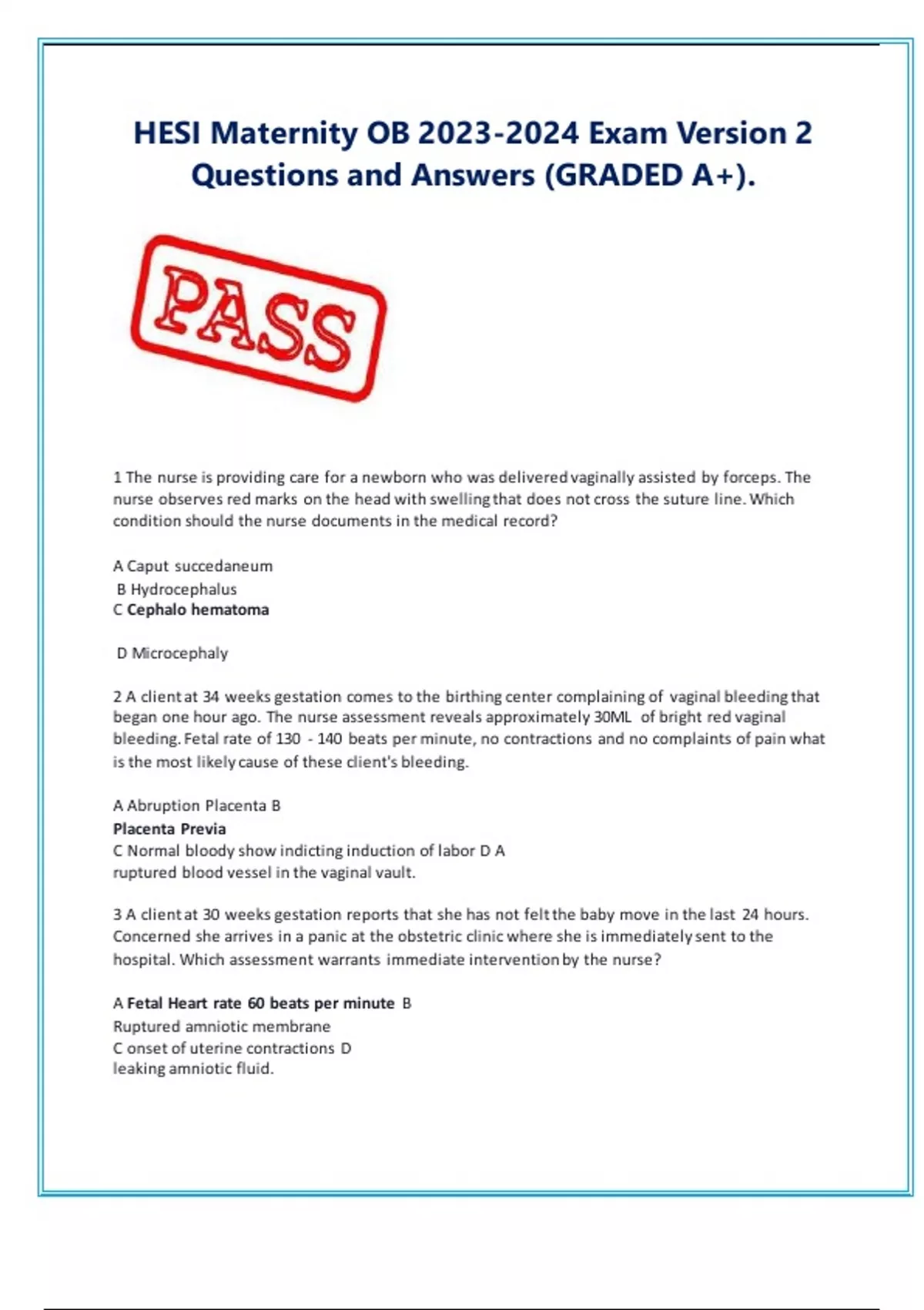 1 The nurse is providing care for a newborn who was delivered vaginally assisted by forceps. The nurse observes red marks on the head with swelling that does not cross the suture line. Which condition should the nurse documents in the medical record? A Caput succedaneum B Hydrocephalus C Cephalo hematoma D Microcephaly 2 A client at 34 weeks gestation comes to the birthing center complaining of vaginal bleeding that began one hour ago. The nurse assessment reveals approximately 30ML of bright red vaginal bleeding. Fetal rate of 130 - 140 beats per minute, no contractions and no complaints of pain what is the most likely cause of these client's bleeding. A Abruption Placenta B Placenta Previa C Normal bloody show indicting induction of labor D A ruptured blood vessel in the vaginal vault. 3 A client at 30 weeks gestation reports that she has not felt the baby move in the last 24 hours. Concerned she arrives in a panic at the obstetric clinic where she is immediately sent to the hospital. Which assessment warrants immediate intervention by the nurse? A Fetal Heart rate 60 beats per minute B Ruptured amniotic membrane C onset of uterine contractions D leaking amniotic fluid.