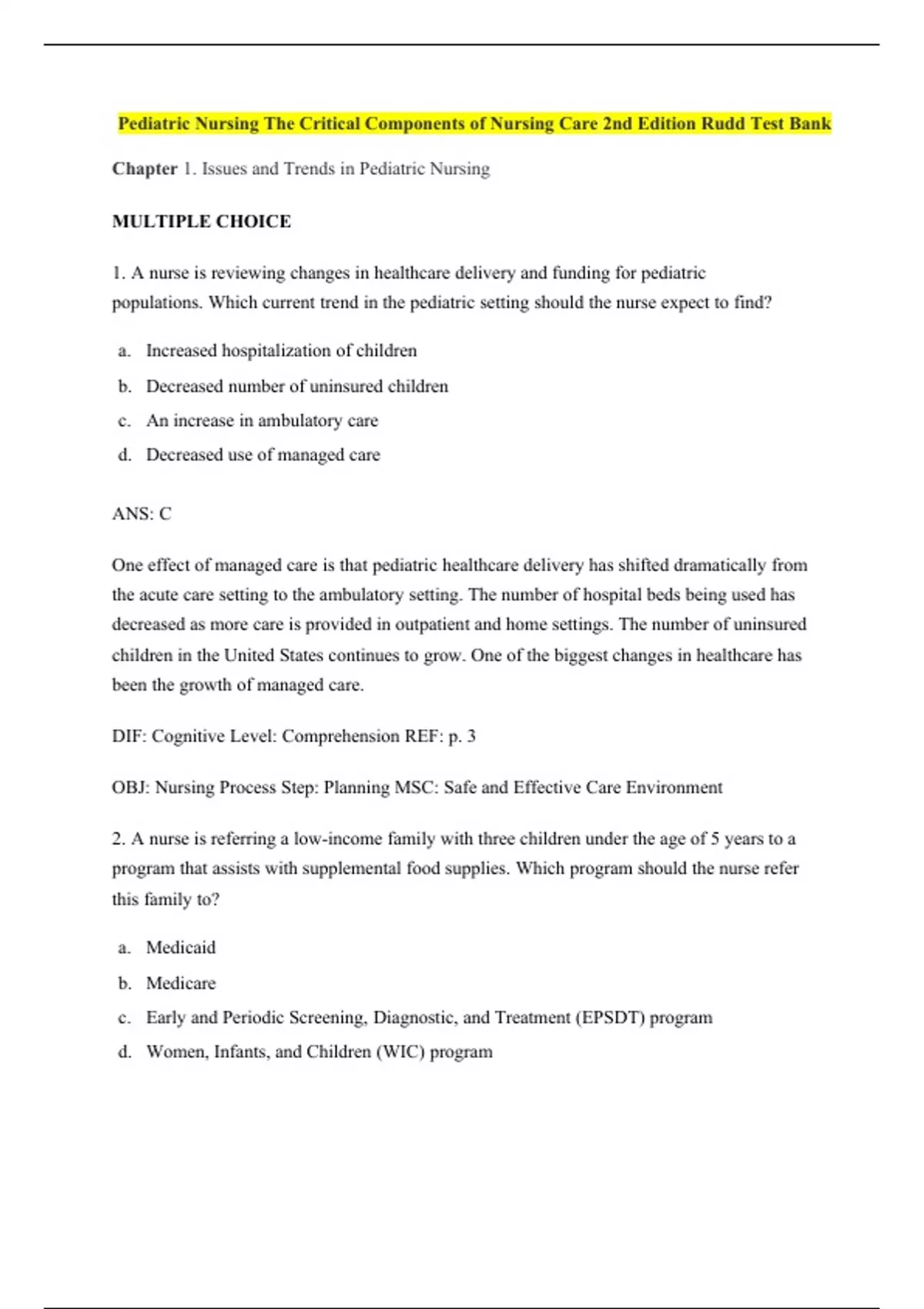 1. A nurse is reviewing changes in healthcare delivery and funding for pediatric populations. Which current trend in the pediatric setting should the nurse expect to find? a. Increased hospitalization of children b. Decreased number of uninsured children c. An increase in ambulatory care d. Decreased use of managed care ANS: C One effect of managed care is that pediatric healthcare delivery has shifted dramatically from the acute care setting to the ambulatory setting. The number of hospital beds being used has decreased as more care is provided in outpatient and home settings. The number of uninsured children in the United States continues to grow. One of the biggest changes in healthcare has been the growth of managed care. DIF: Cognitive Level: Comprehension REF: p. 3 OBJ: Nursing Process Step: Planning MSC: Safe and Effective Care Environment 2. A nurse is referring a low-income family with three children under the age of 5 years to a program that assists with supplemental food supplies. Which program should the nurse refer this family to? a. Medicaid b. Medicare c. Early and Periodic Screening, Diagnostic, and Treatment (EPSDT) program d. Women, Infants, and Children (WIC) program ANS: D WIC is a federal program that provides supplemental food supplies to low-income women who are pregnant or breast-feeding and to their children until the age of 5 years. Medicaid and the Medicaid Early and Periodic Screening, Diagnostic, and Treatment (EPSDT) program provides for well-child examinations and related treatment of medical problems. Children in the WIC program are often referred for immunizations, but that is not the primary focus of the program. Public Law 99-457 provides financial incentives to states to establish comprehensive early intervention services for infants and toddlers with, or at risk for, developmental disabilities. Medicare is the program for Senior Citizens. DIF: Cognitive Level: Application REF: p. 7 OBJ: Nursing Process Step: Implementation MSC: Health Promotion and Maintenance 3. In most states, adolescents who are not emancipated minors must have parental permission before: a. treatment for drug abuse. b. treatment for sexually transmitted diseases (STDs). c. obtaining birth control. d. surgery. ANS: D An emancipated minor is a minor child who has the legal competence of an adult. Legal counsel may be consulted to verify the status of the emancipated minor for consent purposes. Most states allow minors to obtain treatment for drug or alcohol abuse and STDs and allow access to birth control without parental consent. DIF: Cognitive Level: Application REF: p. 12 OBJ: Nursing Process Step: Planning MSC: Safe and Effective Care Environment 4. A nurse is completing a clinical pathway for a child admitted to the hospital with pneumonia. Which characteristic of a clinical pathway is correct? a. Developed and implemented by nurses b. Used primarily in the pediatric setting c. Specific time lines for sequencing interventions d. One of the steps in the nursing process ANS: C Clinical pathways measure outcomes of client care and are developed by multiple healthcare professionals. Each pathway outlines specific time lines for sequencing interventions and reflects interdisciplinary interventions. Clinical pathways are used in multiple settings and for clients throughout the life span. The steps of the nursing process are assessment, diagnosis, planning, implementation, and evaluation. DIF: Cognitive Level: Comprehension REF: p. 6 OBJ: Nursing Process Step: Planning MSC: Safe and Effective Care Environment 5. When planning a parenting class, the nurse should explain that the leading cause of death in children 1 to 4 years of age in the United States is: a. premature birth. b. congenital anomalies. c. accidental death. d. respiratory tract illness. ANS: C Accidents are the leading cause of death in children ages 1 to 19 years. Disorders of short gestation and unspecified low birth weight make up one of the leading causes of death in neonates. One of the leading causes of infant death after the first month of life is congenital anomalies. Respiratory tract illnesses are a major cause of morbidity in children. DIF: Cognitive Level: Application REF: p. 9 OBJ: Nursing Process Step: Implementation MSC: Safe and Effective Care Environment 6. Which statement is true regarding the quality assurance or incident report? a. The report assures the legal department that there is no problem. b. Reports are a permanent part of the clients chart. c. The nurses notes should contain the following: Incident report filed and copy placed in chart. d. This report is a form of documentation of an event that may result in legal action. ANS: D An incident report is a warning to the legal department to be prepared for potential legal action; it is not a part of the clients chart or nurse documentation. DIF: Cognitive Level: Knowledge REF: p. 14 OBJ: Nursing Process Step: Implementation MSC: Safe and Effective Care Environment 7. Which client situation fails to meet the first requirement of informed consent? a. The parent does not understand the physicians explanations. b. The physician gives the parent only a partial list of possible side effects and complications. c. No parent is available and the physician asks the adolescent to sign the consent form. d. The infants teenage mother signs a consent form because her parent tells her to. ANS: C The first requirement of informed consent is that the person giving consent must be competent. Minors are not allowed to give consent. An understanding of information, full disclosure, and voluntary consent are requirements of informed consent, but none of these is the first requirement. DIF: Cognitive Level: Comprehension REF: p. 12 OBJ: Nursing Process Step: Implementation MSC: Safe and Effective Care Environment 8. A nurse assigned to a child does not know how to perform a treatment that has been prescribed for the child. What should the nurses first action be? a. De