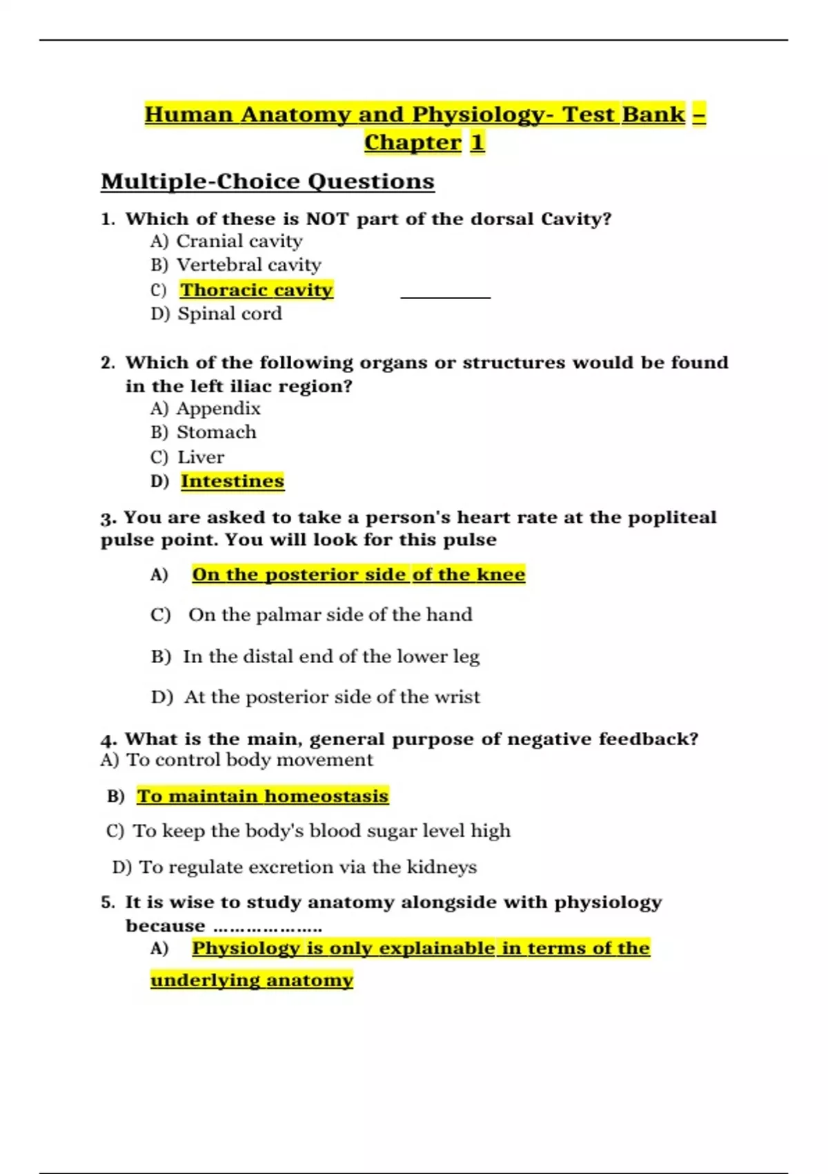 Human Anatomy and Physiology- Test Bank – Chapter 1 Multiple-Choice Questions 1. Which of these is NOT part of the dorsal Cavity? A) Cranial cavity B) Vertebral cavity C) Thoracic cavity D) Spinal cord 2. Which of the following organs or structures would be found in the left iliac region? A) Appendix B) Stomach C) Liver D) Intestines 3. You are asked to take a person's heart rate at the popliteal pulse point. You will look for this pulse A) On the posterior side of the knee C) On the palmar side of the hand B) In the distal end of the lower leg D) At the posterior side of the wrist 4. What is the main, general purpose of negative feedback? A) To control body movement B) To maintain homeostasis C) To keep the body's blood sugar level high D) To regulate excretion via the kidneys 5. It is wise to study anatomy alongside with physiology because ……………….. A) Physiology is only explainable in terms of the underlying anatomy B) It makes for more efficient use of students' and teachers' time C) Anatomy and physiology are practically the same thing D) To understand anatomy requires complete understanding of physiology 6. The Parietal pleura would represent a serous membrane……………. A) Covering the heart B) Covering individual lungs C) Lining the abdominal cavity D) Lining the thoracic cavity 7. Which of the following describes the operation of the heart and blood vessels? A) Cardiovascular anatomy B) Systemic anatomy C) Systemic physiology D) Cardiovascular physiology 8. The dorsal Body Cavity is the site of which of the following? A) Intestines B) Lungs C) Brain D) Liver 9. Prevention of water loss is a necessary function for life that would be best fit in the category of………… A) Excretion B) Responsiveness C) Metabolism D) Maintaining boundaries 10. The term pollex refers to the……………….. A) Calf B) Fingers C) Thumb D) Great toe 11. Some of the nerve endings in the skin are sensitive to changes in temperature. They are part of a negative feedback mechanism regulating body temperature. These nerve ending represented a (n)……….. In the negative feedback mechanism. A) Receptor B) Homeostatic balance or "ideal" value C) Control center D) Effector 12. What is a vertical section through the body, dividing it into anterior and posterior regions called? A) Frontal B) Transverse C) median D) Sagittal 13. Anabolic reactions are chemical reactions of the body that builds things, make the bigger or more complex. Catabolic reactions break things down making them smaller or less complex. If the rate of anabolic reaction in the body is much faster that the rate of catabolic reactions, which of the following necessary life function will be accomplished? A) Responsiveness B) Growth C) Movement D) Digestion 14. The study of anatomy and physiology assumes and describes a healthy body. Select the description below that does NOT explain why this approach is useful. A) Study of a healthy body is less intimidating and more familiar to new students. B) A healthy body provides a common standard to compare to. C) Study of a healthy body provides a foundation for a more complete understanding of all human bodies. D) A healthy body establishes what "normal" is. 15. You are asked to draw blood from the median cubital vein. You will search for this vein in the . A) Proximal arm B) Lateral side of the foot C) Anterior side of the elbow D) Hand 16. The thoracic cavity contains the . It is found to the vertebral cavity. A) Digestive viscera; inferior B) Kidneys and spleen; deep C) Stomach and liver; superficial D) Heart and lungs; anterior 17. Which of the following are survival needs of the body? A) Water, atmospheric pressure, growth, and movement B) Nutrients, water, movement, and reproduction C) Nutrients, water, atmospheric pressure, and oxygen D) Nutrients, water, growth, and reproduction 18. Anatomical position is important because . A) It provides the greatest circulation to the extremities B) It allows diagrams within textbooks to display a greater surface area of the body with one simple diagram C) It allows a common point of reference for body position to help communicate anatomical relationships D) It is the position most comfortable to hospital patients 19. Which of the following statements is the most correct regarding homeostatic imbalance? A) The internal environment is becoming more stable. B) Negative feedback mechanisms are functioning normally. C) It is considered the cause of most diseases. D) Positive feedback mechanisms are overwhelmed. 20. Select the most correct statement. A) Organ systems can be composed of cells or tissues, but not both. B) The endocrine system is not a true structural organ system. C) Organ systems operate independently of each other to maintain life. D) The immune system is closely associated with the lymphatic system. 21. A good example of a positive feedback mechanism would be . A) Blood calcium level regulation B) Regulating glucose levels in the blood C) Body temperature regulation D) Enhancement of labor contractions 22. Choose the following statement that is NOT completely correct regarding serous membranes. A) Serous membranes secrete a watery lubricating fluid. B) Serous membranes are divided into parietal and visceral membranes with a virtual space between the two. C) Visceral pericardium covers the outer surface of the heart, and parietal pericardium lines the internal walls of the heart. D) Serosa are very thin, double-layered structures. 23. One of the descriptions below is from the perspective of physiological study, the rest are from an anatomical perspective. Select the description below that comes from physiological perspective. A) The pancreas lies deep to the stomach within the abdominal cavity. B) The skull is formed by 22 facial and cranial bones. C) The chambers of the heart and blood vessels leading to and from the heart are separated by valves composed of fibrous connective tissue. D) The contraction of smooth muscl