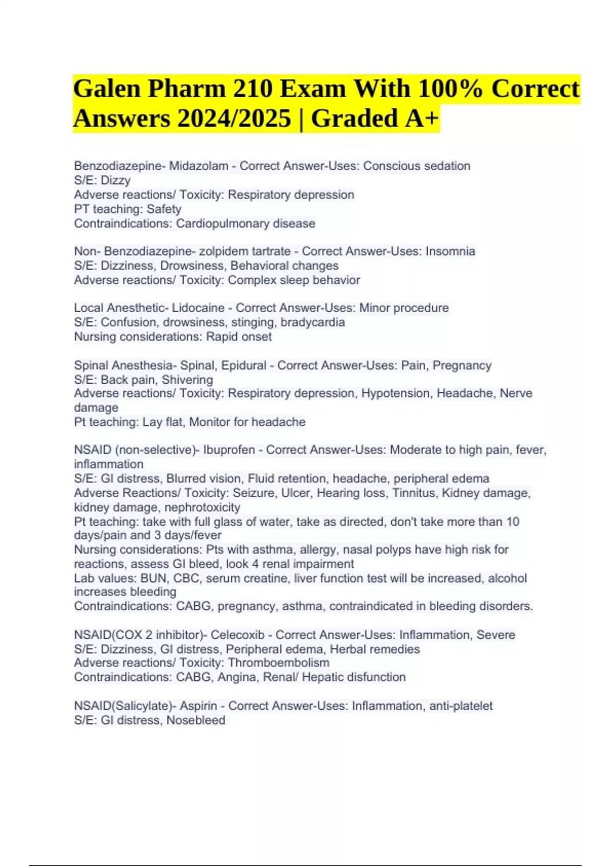 Benzodiazepine- Midazolam - Correct Answer-Uses: Conscious sedation S/E: Dizzy Adverse reactions/ Toxicity: Respiratory depression PT teaching: Safety Contraindications: Cardiopulmonary disease Non- Benzodiazepine- zolpidem tartrate - Correct Answer-Uses: Insomnia S/E: Dizziness, Drowsiness, Behavioral changes Adverse reactions/ Toxicity: Complex sleep behavior Local Anesthetic- Lidocaine - Correct Answer-Uses: Minor procedure S/E: Confusion, drowsiness, stinging, bradycardia Nursing considerations: Rapid onset Spinal Anesthesia- Spinal, Epidural - Correct Answer-Uses: Pain, Pregnancy S/E: Back pain, Shivering Adverse reactions/ Toxicity: Respiratory depression, Hypotension, Headache, Nerve damage Pt teaching: Lay flat, Monitor for headache NSAID (non-selective)- Ibuprofen - Correct Answer-Uses: Moderate to high pain, fever, inflammation S/E: GI distress, Blurred vision, Fluid retention, headache, peripheral edema Adverse Reactions/ Toxicity: Seizure, Ulcer, Hearing loss, Tinnitus, Kidney damage, kidney damage, nephrotoxicity Pt teaching: take with full glass of water, take as directed, don't take more than 10 days/pain and 3 days/fever Nursing considerations: Pts with asthma, allergy, nasal polyps have high risk for reactions, assess GI bleed, look 4 renal impairment Lab values: BUN, CBC, serum creatine, liver function test will be increased, alcohol increases bleeding Contraindications: CABG, pregnancy, asthma, contraindicated in bleeding disorders. NSAID(COX 2 inhibitor)- Celecoxib - Correct Answer-Uses: Inflammation, Severe S/E: Dizziness, GI distress, Peripheral edema, Herbal remedies Adverse reactions/ Toxicity: Thromboembolism Contraindications: CABG, Angina, Renal/ Hepatic disfunction NSAID(Salicylate)- Aspirin - Correct Answer-Uses: Inflammation, anti-platelet S/E: GI distress, Nosebleed Galen Pharm 210 Exam With 100% Correct Answers 2024/2025 | Graded A+ Adverse reactions/ Toxicity: Hearing, Tinnitus, Reye syndrome, Hyperuricemia Contraindications: GI bleeding, Gout, Pregnancy Anti-gout- Allopurinol - Correct Answer-Uses: Lowers uric acid levels S/E: GI upset, dizziness Adverse reactions/ Toxicity: Hepatotoxicity, hepatotoxicity Pt teaching: No alcohol, increase water intake, alkaline diet Nursing considerations: I &O, monitor kidney function Lab values: I&O, BUN, Creatinine Contraindications: Severe kidney disease Non- Opioid Analgesic- Acetaminophen - Correct Answer-Uses: Pain, fever, NOT NSAID S/E: GI upset Adverse reactions/ Toxicity: Hepatotoxicity (Liver), steven Johnson syndrome, epidermal necrolysis Pt teaching: Take exactly as directed, chronic used can lead to hepatotoxicity, avoid alcohol, consult PCP if fever not relieved in 3 days. Nursing considerations: Asses for overall alcohol use and health status. Lab values: Evaluate hepatic hematologic & renal function. (About 4g/per day) Opioid Analgesic- Morphine sulfate - Correct Answer-Uses: MI, Cancer pain, SOB for dyspnea S/E: urinary retention, dizziness, pinpoint pupils Adverse reactions/ Toxicity: Respiratory depression, severe hypotension Pt teaching: teach of abuse potential, avoid use of alcohol, change positions Nursing Considerations: Use extreme caution with MAO inhibitors, assess conscience level, BP, pulse, and respirations Lab values: Liver enzymes Contraindications: hepatic/ renal dysfunction Opioid Antagonist (NARCAN)- Naloxone - Correct Answer-Uses: Opioid overdose, Reserves respiratory depression S/E: N/V, hypertension, hypotension Adverse reactions/ Toxicity: Ventricular arrhythmias Nursing Considerations: monitor respiratory rate, BP, and pulse, given in slow increments. Anti- (Migraine)- Sumatriptan - Correct Answer-Uses: Migraines, Cluster headache S/E: Drowsy, Flushing, warm sensation Adverse reactions/ Toxicity: Bradycardia Pt teaching: Only use during a migraine attack, avoid alcohol, overuse can cause headache Contraindications: History of hypertension, liver failure, pregnancy CNS Stimulant- (Amphetamine Like drug)- Methylphenidate - Correct Answer-Uses: ADHD, Narcolepsy S/E: Insomnia, Irritability, weight loss, decreased appetite Adverse reactions/ Toxicity: Growth suppression, Hypertension, Tachycardia, sudden death, anaphylaxis, PT teaching: Take early in day, Eat more calories Nursing considerations: Monitor height/weight Contraindications: Anxiety, hypertension, history of seizures, coronary artery disease Antiseizure- (Valproate)- Valproate acid - Correct Answer-Uses: Seizures S/E: Drowsy, Dizzy Adverse reactions/ Toxicity: hepatotoxicity, suicidal thoughts Pt teaching: monitor CBC, platelets, bleeding time Nursing considerations: Institute seizure, precautions, assess suicidal tendencies Contraindications: Pregnancy, PT's with liver disease ( Take 2-3 hours before or after antacids)( Take @ same time every day) Antiseizure- Barbiturate- Phenobarbital - Correct Answer-Uses: Anti-convulsant S/E: Drowsy, Dizzy Adverse reactions/ Toxicity: Respiratory depression if you take too much Pt teaching: Notify PCP of S/S of angioedema, fever, sore throat, swelling, nose bleeds, No alcohol Nursing considerations: Monitor BP, Pulse, Resp, S/S of angioedema Lab values: Hepatic function, renal function, CBC Contraindications: Pregnancy ( Take 2-3 hours before or after antiacids)( Take @ same time every day) Antiseizure- Hydantoin- Phenytoin - Correct Answer-Uses: prevention of grand mal Seizures S/E: Red/pink urine, N/V, thick gums, drowsy, hypotension, ataxia Adverse reactions/ Toxicity: Steven Johnson syndrome, blood dysrasia, aplastic anemia, suicidal thoughts, cardiac arrest Pt teaching: monitor behavior changes Nursing considerations: Do not take with anticoagulants or warfarin, no herbal remedies, eat more calcium, avoid alcohol Lab values: Monitor drug levels Contraindications: Pregnancy, drugs that mess with blood ( Take 2-3 hours before or after antacids)( Take @ same time every day) Benzodiazepine- Lorazepam - Correct Answer-Uses: Acute alcohol withdrawal S/E: Drowsy, Dizziness Adverse reacti