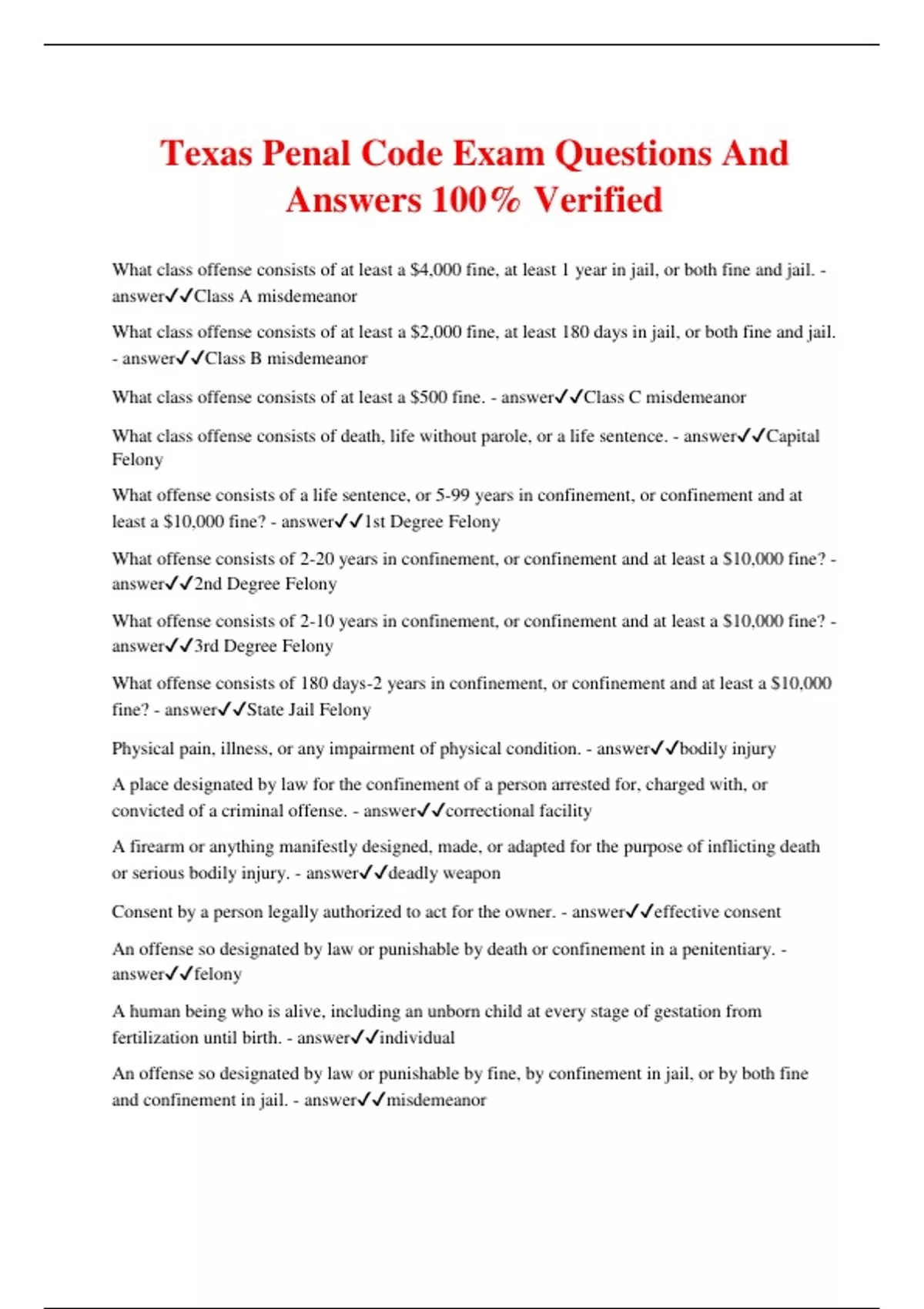 Texas Penal Code Exam Questions And Answers 100% Verified What class offense consists of at least a $4,000 fine, at least 1 year in jail, or both fine and jail. - answerClass A misdemeanor What class offense consists of at least a $2,000 fine, at least 180 days in jail, or both fine and jail. - answerClass B misdemeanor What class offense consists of at least a $500 fine. - answerClass C misdemeanor What class offense consists of death, life without parole, or a life sentence. - answerCapital Felony What offense consists of a life sentence, or 5-99 years in confinement, or confinement and at least a $10,000 fine? - answer1st Degree Felony What offense consists of 2-20 years in confinement, or confinement and at least a $10,000 fine? - answer2nd Degree Felony What offense consists of 2-10 years in confinement, or confinement and at least a $10,000 fine? - answer3rd Degree Felony What offense consists of 180 days-2 years in confinement, or confinement and at least a $10,000 fine? - answerState Jail Felony Physical pain, illness, or any impairment of physical condition. - answerbodily injury A place designated by law for the confinement of a person arrested for, charged with, or convicted of a criminal offense. - answercorrectional facility A firearm or anything manifestly designed, made, or adapted for the purpose of inflicting death or serious bodily injury. - answerdeadly weapon Consent by a person legally authorized to act for the owner. - answereffective consent An offense so designated by law or punishable by death or confinement in a penitentiary. - answerfelony A human being who is alive, including an unborn child at every stage of gestation from fertilization until birth. - answerindividual An offense so designated by law or punishable by fine, by confinement in jail, or by both fine and confinement in jail. - answermisdemeanor Failure to act. - answeromission Any place to which the public or a substantial group of the public has access. - answerpublic place A belief that would be held by an ordinary and prudent person in the same circumstances as the actor. - answerreasonable belief The commission of two or more offenses, regardless of whether the harm is directed toward or inflicted upon more than one person or item of property. - answercriminal episode What are the 4 culpable mental states? - answer1)intentional 2)knowing 3)reckless 4)criminal negligence When it is a person's conscious objective or desire to engage in the conduct or cause the result. - answerintentionally When a person is aware of the nature of his conduct or that the circumstances exist, and is aware that his/her conduct is reasonably certain to cause the result. - answerknowingly When a person is aware but consciously disregards a substantial and unjustifiable risk that the circumstances exist or the result will occur. - answerrecklessly When a person ought to be aware of a substantial and unjustifiable risk that the circumstances exist or the result will occur. - answercriminally negligent Each part to an offense of a crime may be charged with commission of the offense. T or F? - answerT Which is not a defense to criminal responsibility? 1)insanity 2)mistake of fact 3)mistake of law 4)duress - answermistake of law A person who does an act amounting to more than mere preparation that tends but fails to effect the commission of the offense intended. - answercriminal attempt A person commits __ __ if with intent that felony be committed he agrees with one or more persons that they or one or more of them engage in conduct that would constitute the offense and