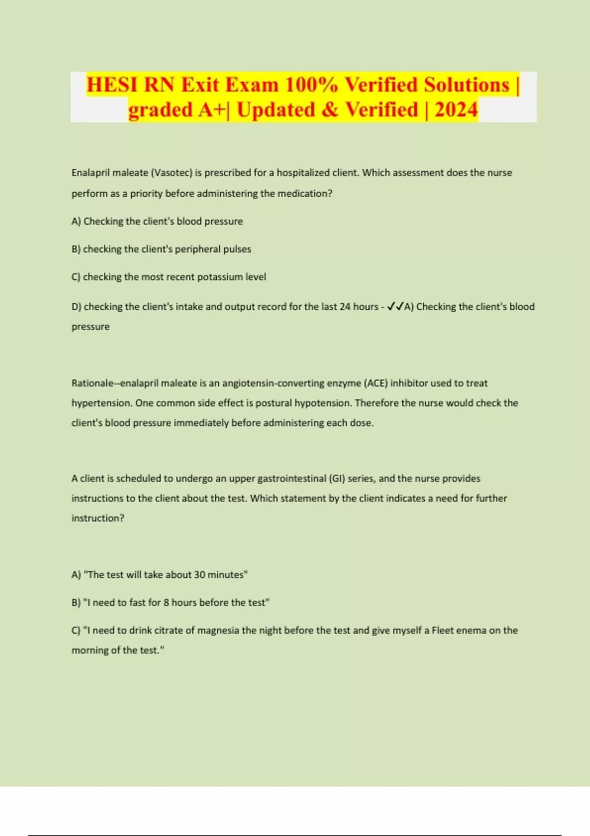 Enalapril maleate (Vasotec) is prescribed for a hospitalized client. Which assessment does the nurse perform as a priority before administering the medication? A) Checking the client's blood pressure B) checking the client's peripheral pulses C) checking the most recent potassium level D) checking the client's intake and output record for the last 24 hours - A) Checking the client's blood pressure Rationale--enalapril maleate is an angiotensin-converting enzyme (ACE) inhibitor used to treat hypertension. One common side effect is postural hypotension. Therefore the nurse would check the client's blood pressure immediately before administering each dose. A client is scheduled to undergo an upper gastrointestinal (GI) series, and the nurse provides instructions to the client about the test. Which statement by the client indicates a need for further instruction? A) "The test will take about 30 minutes" B) "I need to fast for 8 hours before the test" C) "I need to drink citrate of magnesia the night before the test and give myself a Fleet enema on the morning of the test.