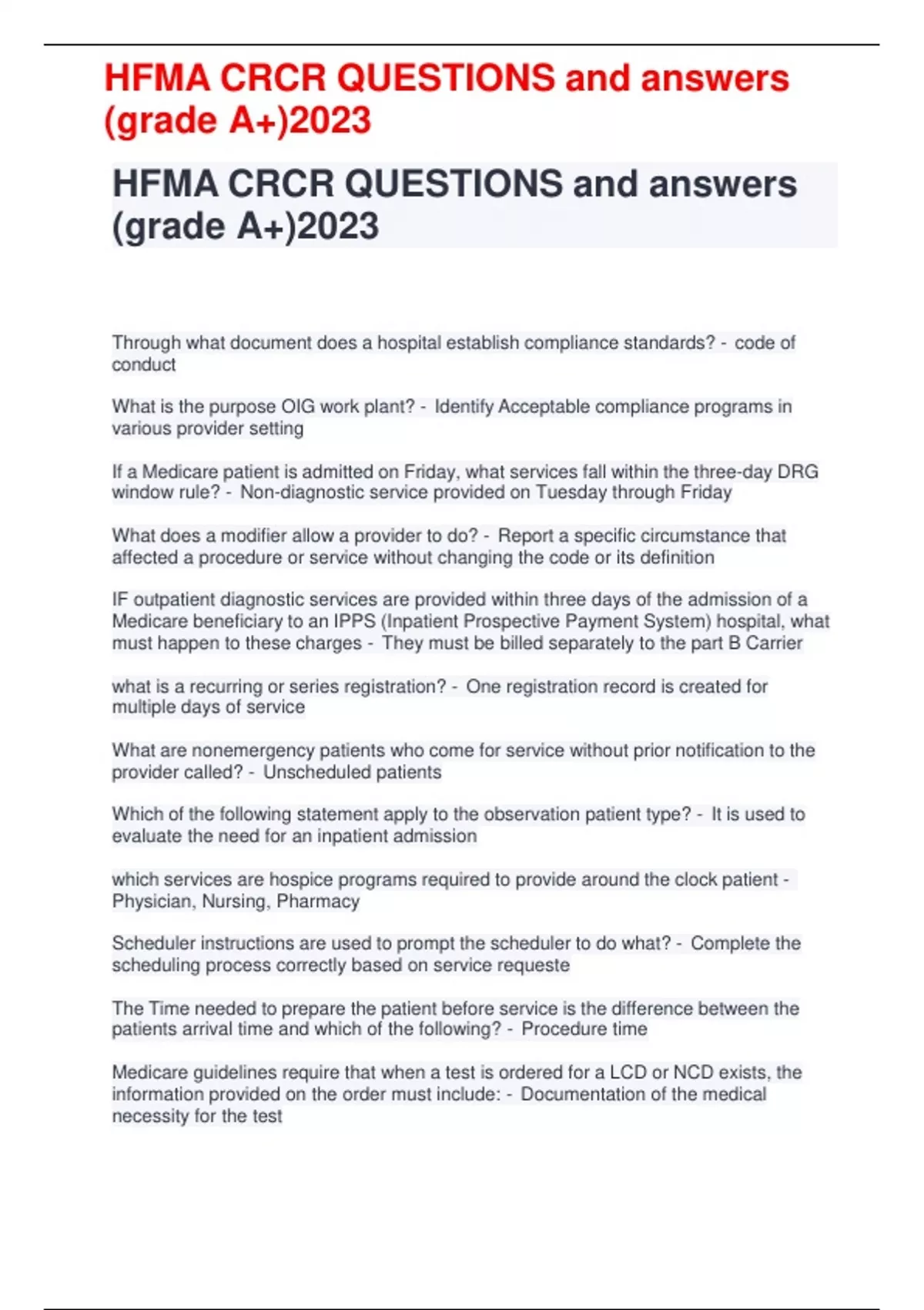 HFMA CRCR QUESTIONS and answers (grade A+)2023 Through what document does a hospital establish compliance standards? - code of conduct What is the purpose OIG work plant? - Identify Acceptable compliance programs in various provider setting If a Medicare patient is admitted on Friday, what services fall within the three-day DRG window rule? - Non-diagnostic service provided on Tuesday through Friday What does a modifier allow a provider to do? - Report a specific circumstance that affected a procedure or service without changing the code or its definition IF outpatient diagnostic services are provided within three days of the admission of a Medicare beneficiary to an IPPS (Inpatient Prospective Payment System) hospital, what must happen to these charges - They must be billed separately to the part B Carrier what is a recurring or series registration? - One registration record is created for multiple days of service What are nonemergency patients who come for service without prior notification to the provider called? - Unscheduled patients Which of the following statement apply to the observation patient type? - It is used to evaluate the need for an inpatient admission which services are hospice programs required to provide around the clock patient - Physician, Nursing, Pharmacy Scheduler instructions are used to prompt the scheduler to do what? - Complete the scheduling process correctly based on service requeste The Time needed to prepare the patient before service is the difference between the patients arrival time and which of the following? - Procedure time Medicare guidelines require that when a test is ordered for a LCD or NCD exists, the information provided on the order must include: - Documentation of the medical necessity for the test HFMA CRCR QUESTIONS and answers (grade A+)2023 HFMA CRCR QUESTIONS and answers (grade A+)2023