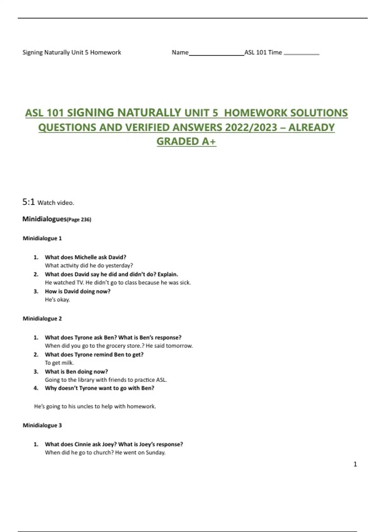 ASL 101 SIGNING NATURALLY UNIT 5 HOMEWORK SOLUTIONS ASL 101 SIGNING NATURALLY UNIT 5 HOMEWORK SOLUTIONS QUESTIONS AND VERIFIED ANSWERS 2022/2023 – ALREADY GRADED A+ 5:1 Watch video. Minidialogues(Page 236) Minidialogue 1 1. What does Michelle ask David? What activity did he do yesterday? 2. What does David say he did and didn’t do? Explain. He watched TV. He didn’t go to class because he was sick. 3. How is David doing now? He’s okay. Minidialogue 2 1. What does Tyrone ask Ben? What is Ben’s response? When did you go to the grocery store.? He said tomorrow. 2. What does Tyrone remind Ben to get? To get milk. 3. What is Ben doing now? Going to the library with friends to practice ASL. 4. Why doesn’t Tyrone want to go with Ben? He’s going to his uncles to help with homework. Minidialogue 3 1. What does Cinnie ask Joey? What is Joey’s response? When did he go to church? He went on Sunday.