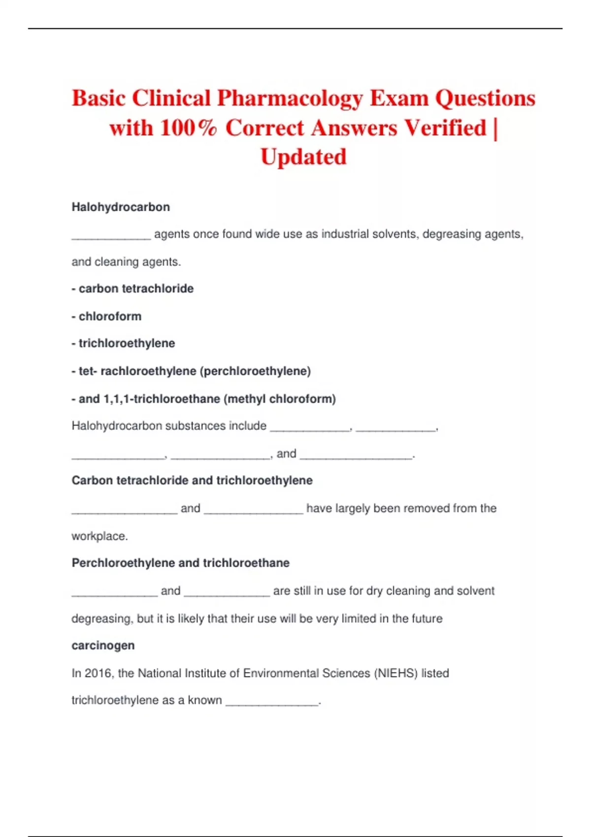 Basic Clinical Pharmacology Exam Questions with 100% Correct Answers Verified | Updated Halohydrocarbon ____________ agents once found wide use as industrial solvents, degreasing agents, and cleaning agents. - carbon tetrachloride - chloroform - trichloroethylene - tet- rachloroethylene (perchloroethylene) - and 1,1,1-trichloroethane (methyl chloroform) Halohydrocarbon substances include ____________, ____________, ______________, _______________, and _________________. Carbon tetrachloride and trichloroethylene ________________ and _______________ have largely been removed from the workplace. Perchloroethylene and trichloroethane _____________ and _____________ are still in use for dry cleaning and solvent degreasing, but it is likely that their use will be very limited in the future carcinogen In 2016, the National Institute of Environmental Sciences (NIEHS) listed trichloroethylene as a known ______________. National Institute of Environmental Sc