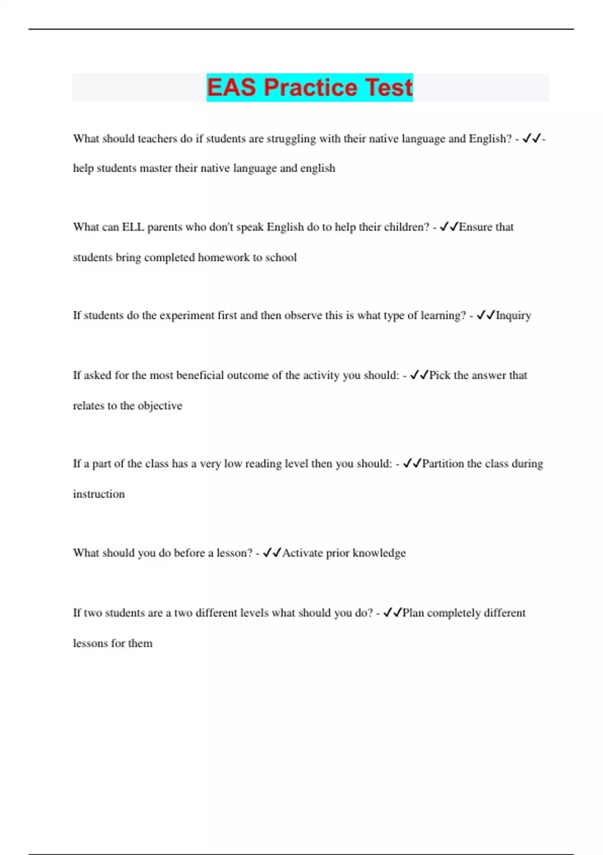 EAS Practice Test What should teachers do if students are struggling with their native language and English? - - help students master their native language and english What can ELL parents who don't speak English do to help their children? - Ensure that students bring completed homework to school If students do the experiment first and then observe this is what type of learning? - Inquiry If asked for the most beneficial outcome of the activity you should: - Pick the answer that relates to the objective If a part of the class has a very low reading level then you should: - Partition the class during instruction What should you do before a lesson? - Activate prior knowledge If two students are a two different levels what should you do? - Plan completely different lessons for them Character trait diagram - Displays the relationship among traits of two characters or the traits of a character and a real person Cultural responsiveness - Giving students opportunity to discuss their own culture in context of another culture Should ELL students review their partners reports? - Yes What would negatively impact ELL learners? - Reducing the length of the report they are required to write Do students learn speaking or reading skills first? - Speaking What is the best way to have ELL students successful in reading? - Provide them with graphic organizers that list important words from the articles and online resources Who should teachers interact with when helping ELL students? - ESOL teacher How do learning disabled students learn best? - If they are taught words directly in a clear and explicit fashion Who should teachers interact with when they need help with sped students? - Sped teacher If a student with emotional disturbance doesn't know how to act what do you do? - Role play appropriate behavioral strategies in the resource room to model the appropriate strategies in the classroom When should a non disabled person be presumed to have a disability for discipline purposes under new work state regulation? - Any school personnel specifically expressed concerns about the student to supervisory personnel. Or a parent could have made a prior request in writing. When should a disabled person be presumed to have a disability for discipline purposes under New York State regulations? - The parent can express the concern verbally What is the most likely reason a teacher would raise expectations with the classified students? - To increase student participation What does the ny state education law say about ELL teaching? - The law requires instruction in English unleaded waived by the commissioner if an ELL student is of foreign birth or ancestry. Limits to 6 years How should teachers ask questions? - To the entire class Modeling - Demonstrate the behavior students should replicate How many parents need to be present at the CSE meeting? - Only one, unless the second parent has a written request to be required to attend the meeting What is the problem with tracking systems? - They have been shown to consistently discriminate against minority students If you have health information about a student you must - Keep it confidential When helping during a lesson you always want to focus on the students ....... - Strength Strategies to help ELL students identify details when reading - Graphic organizer and pairing students if they speak the same language