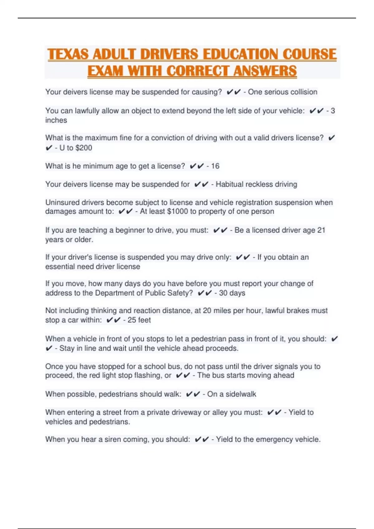 TEXAS ADULT DRIVERS EDUCATION COURSE EXAM WITH CORRECT ANSWERS