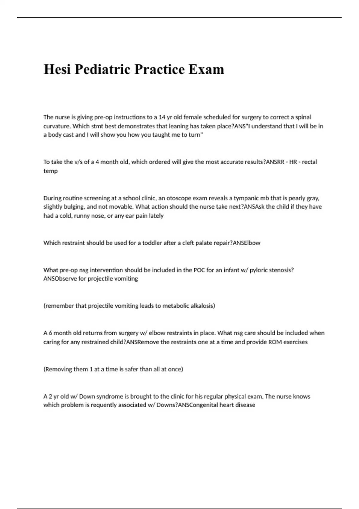 Hesi Pediatric Practice Exam Questions and Answers 2024 Latest Edition