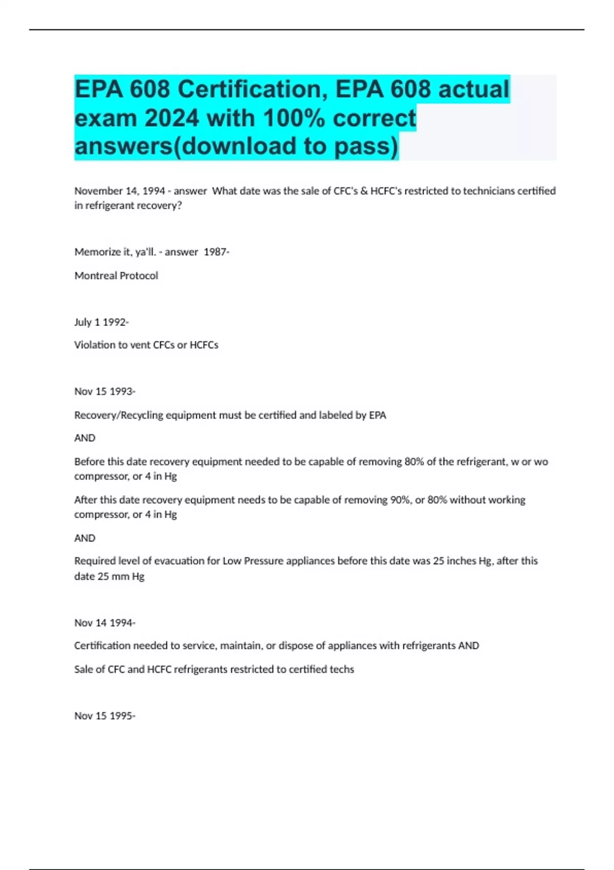 EPA 608 Certification, EPA 608 actual exam 2024 with 100% correct answers(download to pass)