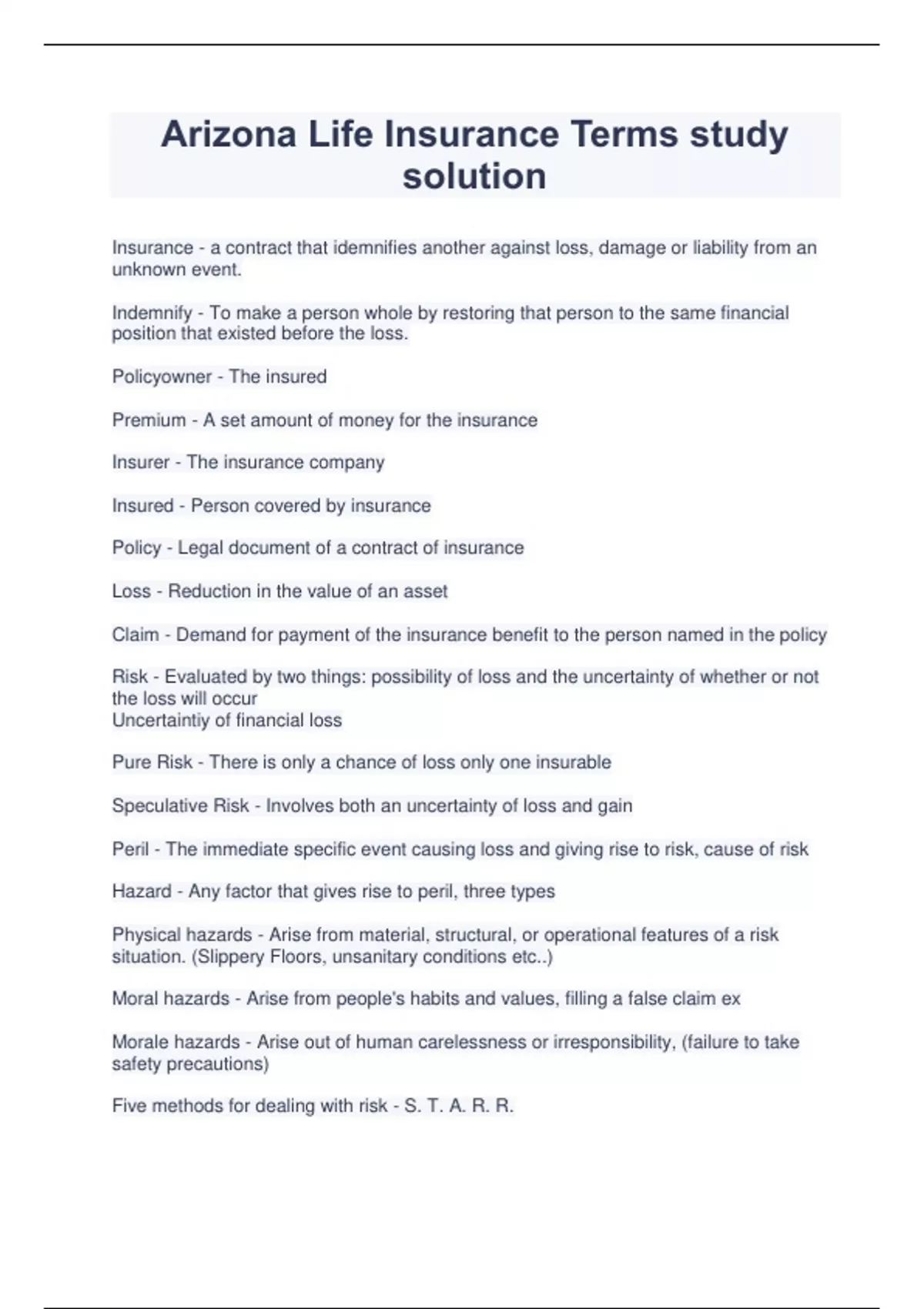 Arizona Life Insurance Terms study solution.