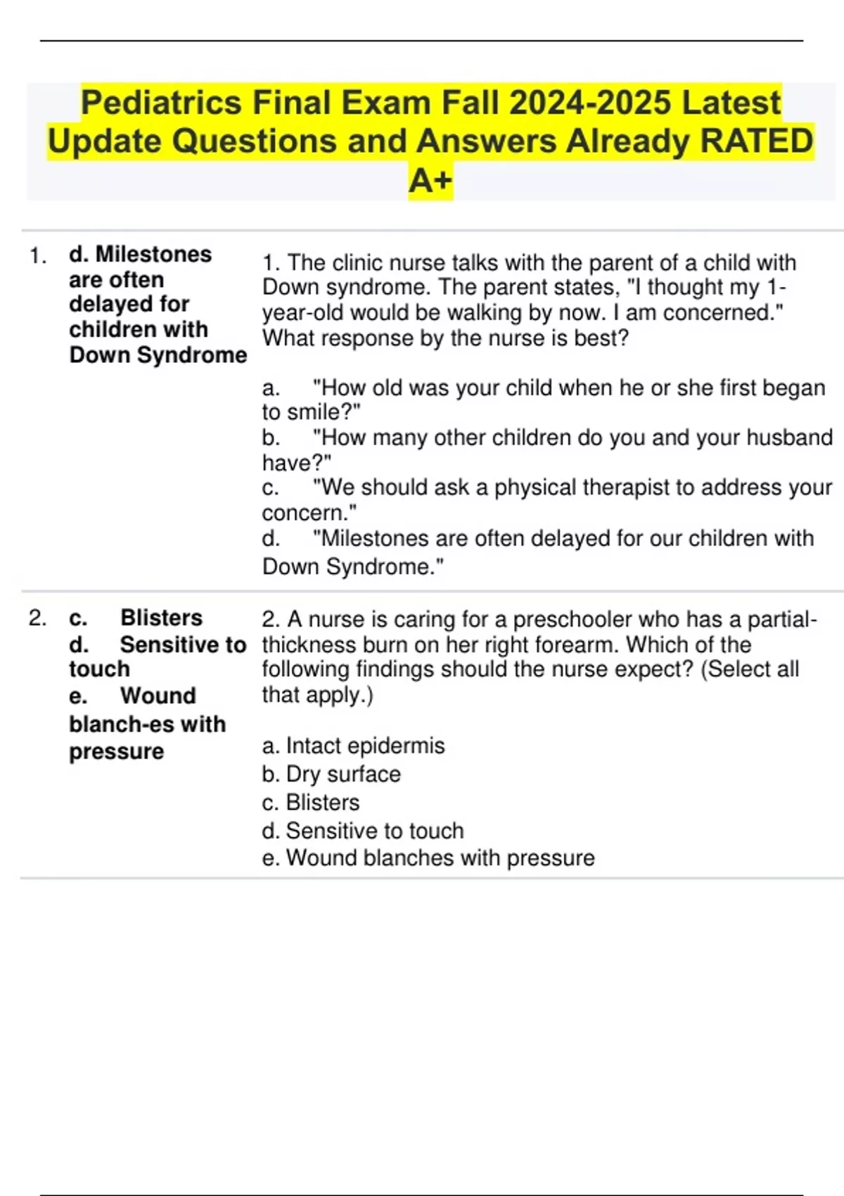 Pediatrics Final Exam Fall Latest Update Questions and Answers Already RATED A+