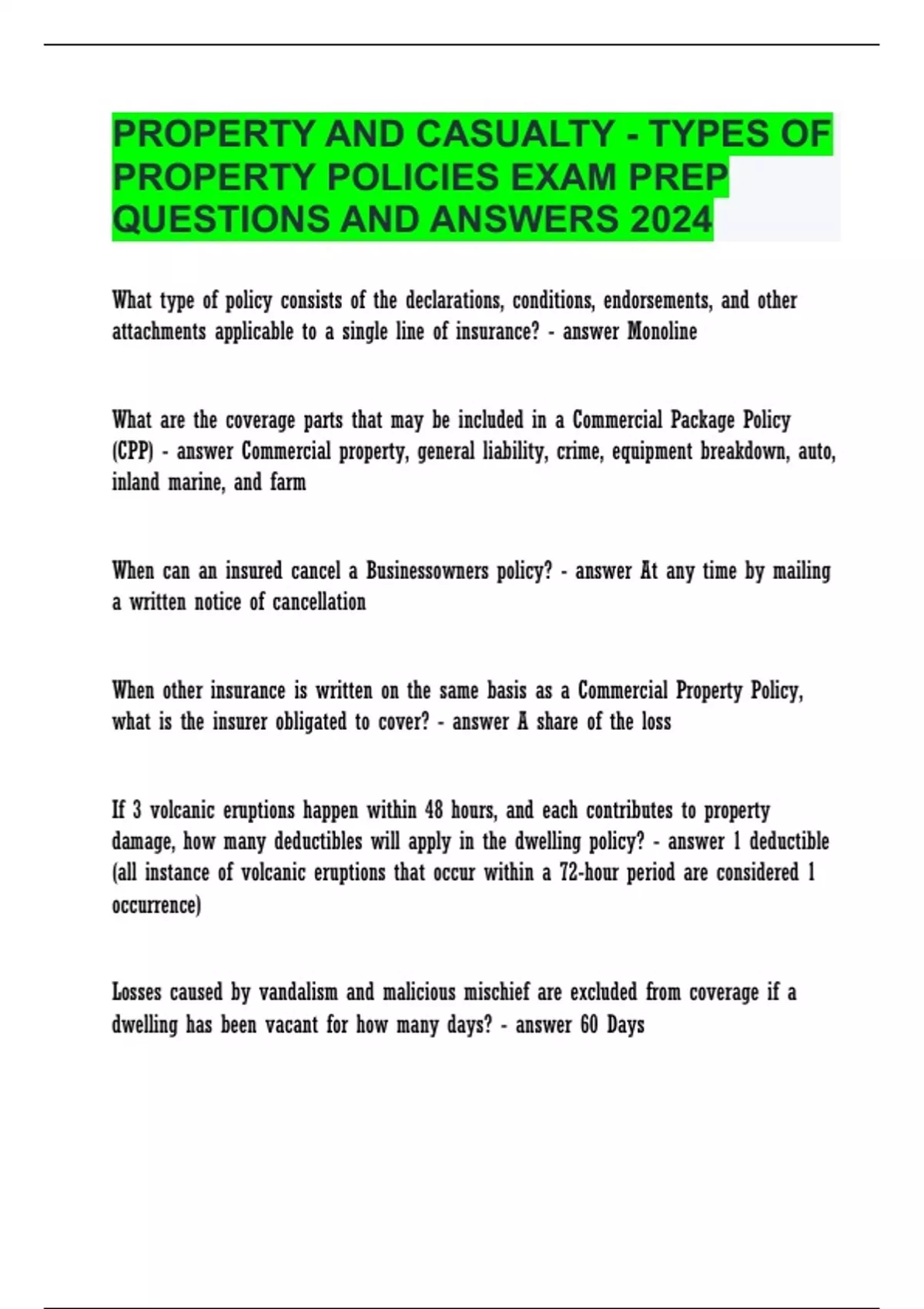PROPERTY AND CASUALTY - TYPES OF PROPERTY POLICIES EXAM PREP QUESTIONS AND ANSWERS