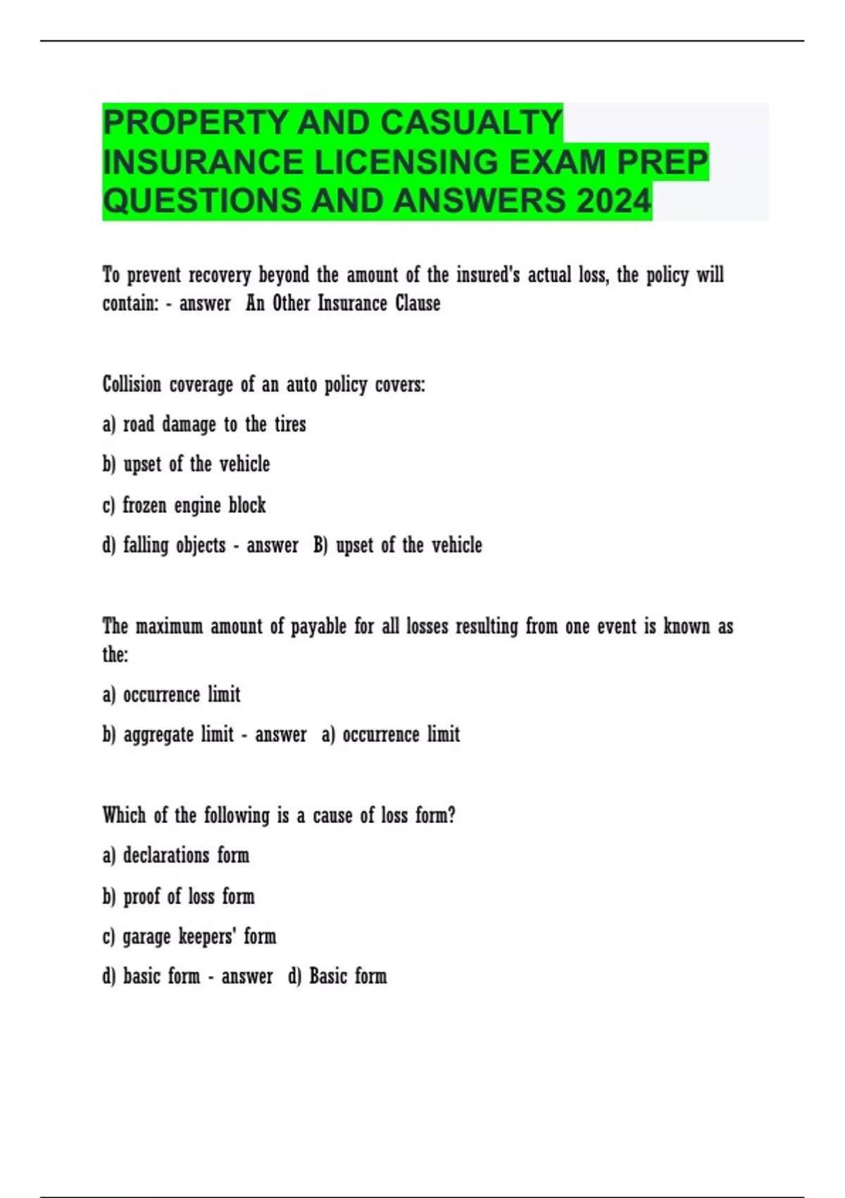 PROPERTY AND CASUALTY INSURANCE LICENSING EXAM PREP QUESTIONS AND ANSWERS 2024.
