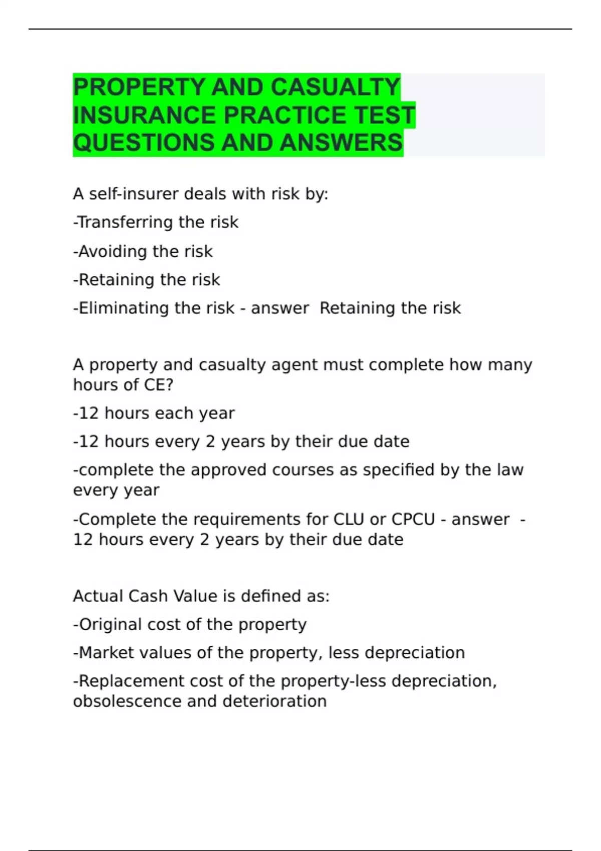 OREGON STATE PROPERTY AND CASUALTY EXAM PREP QUESTIONS AND ANSWERS 2024