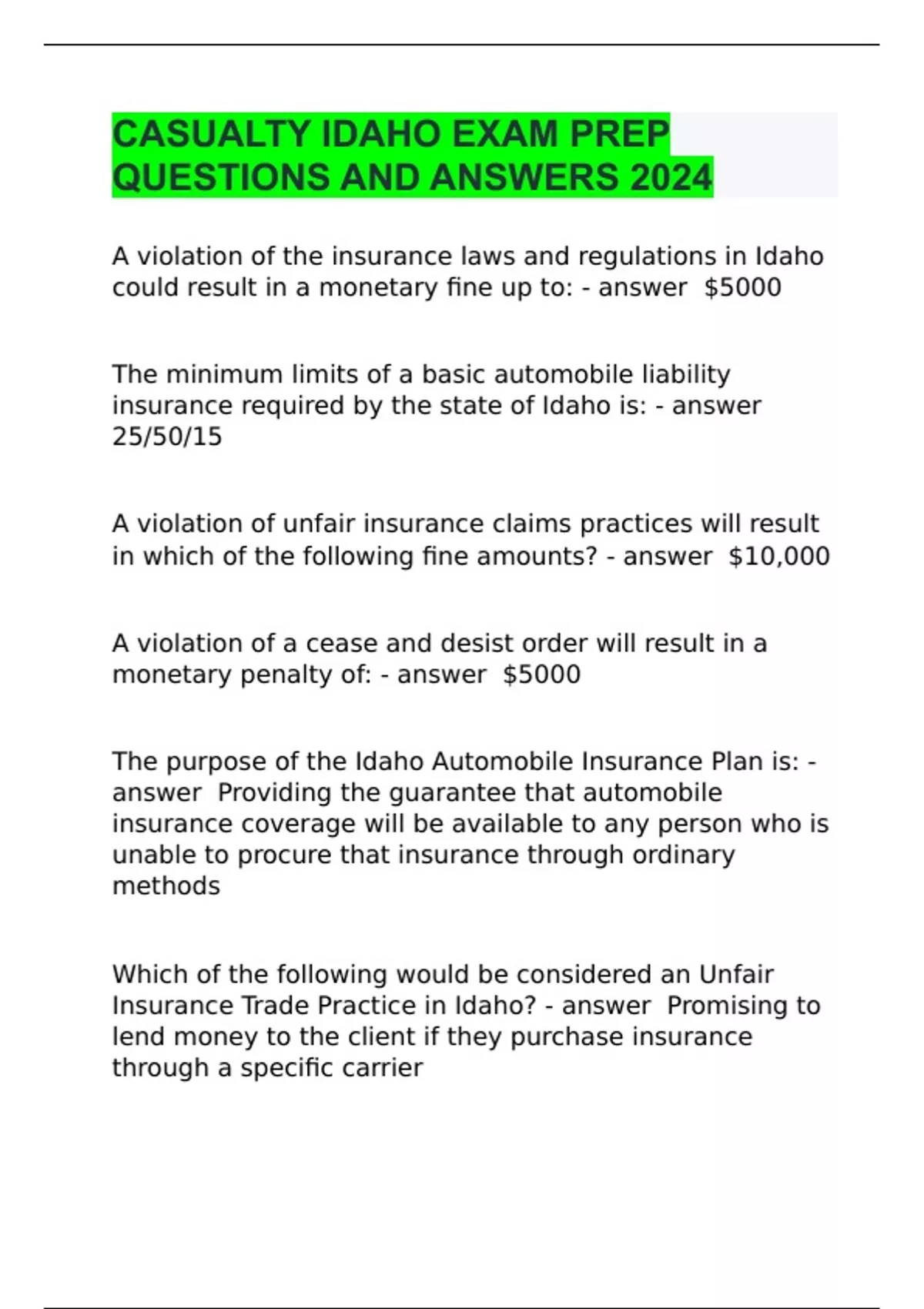 CASUALTY IDAHO EXAM PREP QUESTIONS AND ANSWERS 2024