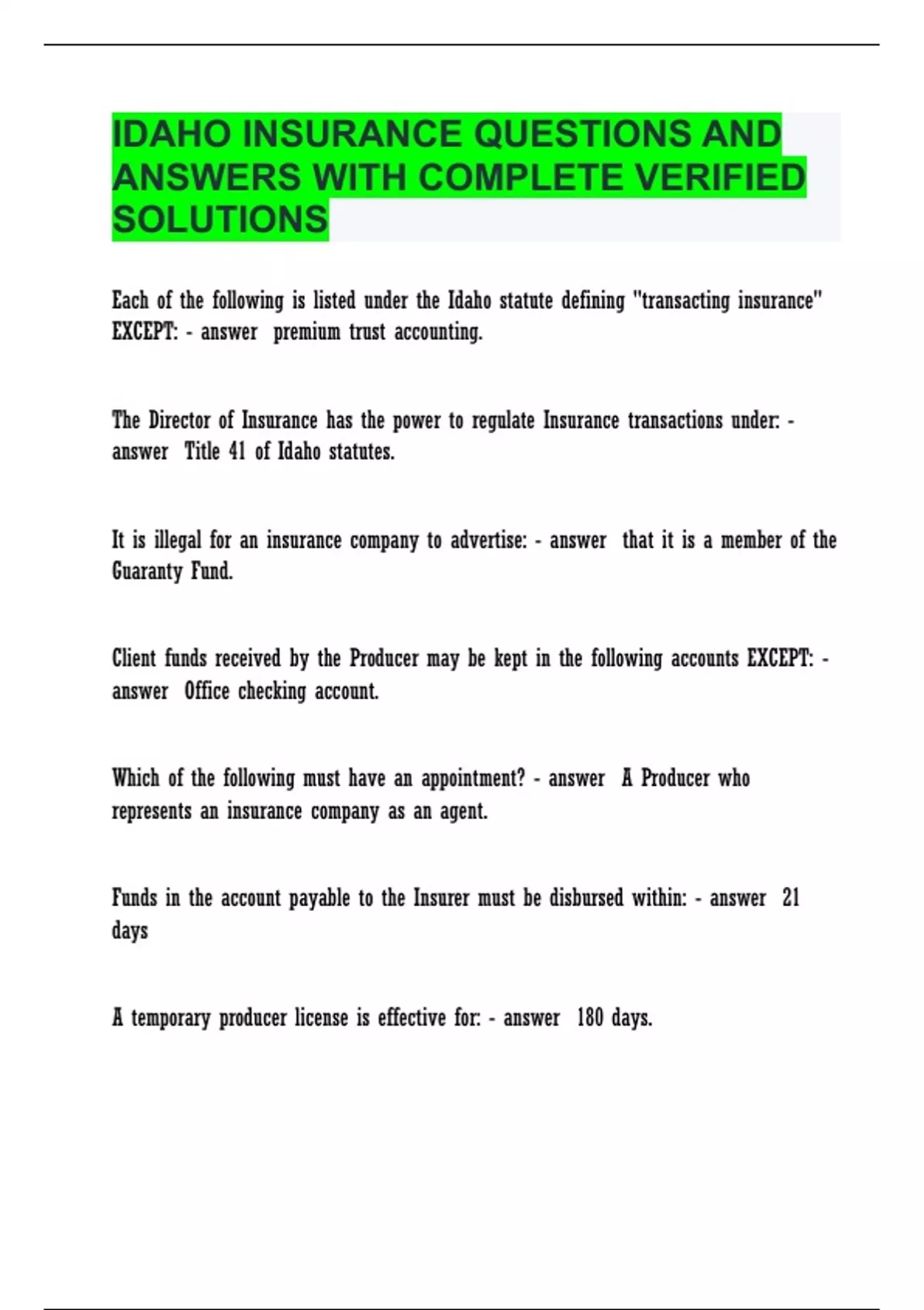 IDAHO INSURANCE QUESTIONS AND ANSWERS WITH COMPLETE VERIFIED SOLUTIONS