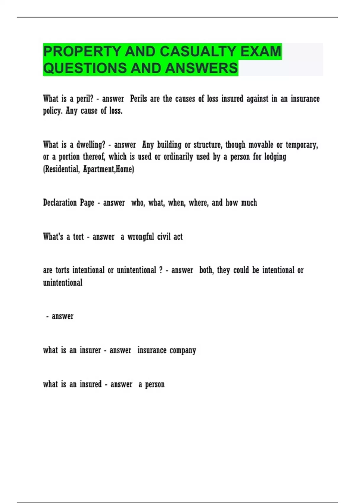 PROPERTY AND CASUALTY EXAM QUESTIONS AND ANSWERS
