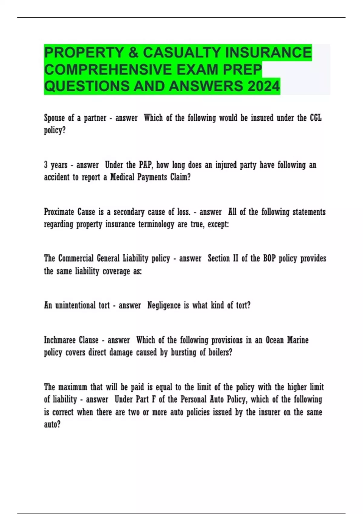 PROPERTY & CASUALTY INSURANCE COMPREHENSIVE EXAM PREP QUESTIONS AND ANSWERS