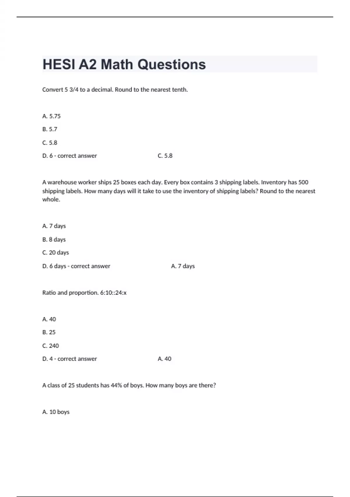 Convert 5 3/4 to a decimal. Round to the nearest tenth. A. 5.75 B. 5.7 C. 5.8 D. 6 - correct answer C. 5.8 A warehouse worker ships 25 boxes each day. Every box contains 3 shipping labels. Inventory has 500 shipping labels. How many days will it take to use the inventory of shipping labels? Round to the nearest whole. A. 7 days B. 8 days C. 20 days D. 6 days - correct answer A. 7 days Ratio and proportion. 6:10::24:x A. 40 B. 25 C. 240 D. 4 - correct answer A. 40 A class of 25 students has 44% of boys. How many boys are there? A. 10 boys B. 11 boys C. 9 boys D. 13 boys - correct answer B. 11 boys 3.44 divided by 0.6 A. 0.57 B. 5.73 C. 11.41 D. 2.33 - correct answer B. 5.73 Solve if x=11. x+44/2x A. 55/22 B. 33 C. c D. 13 - correct answer D. 13 4 & 7/8 divided by 1 & 1/6 A. 4 & 5/28 B. 4 & 6/8 C. 4 & 7/8 D. 5 & 8/14 - correct answer A. 4 & 5/28 Add. 6 & 3/4 + 8 & 1/6 A. 35/6 B. 14 & 2/5 C. 14 & 11/12 D. 12 & 3/24 - correct answer C. 14 & 11/12 Solve for x. x/250=3/500 A. 1.5 B. 2.5 C. 1500 D. 25.5 - correct answer A. 1.5 A dice is rolled. What is the probability of getting 5? A. 20% B. 50% C. 16.6% D. 83.3% - correct answer C. 16.6% Convert to metric: 7 gram = x mg A. 700mg B. 0.007 mg C. 7,000 mg D. 0.0007 mg - correct answer C. 7,000 mg Sally eats 3/5 of her lunch. John eats 75%. Who ate more? A. John B. Sally - correct answer A. John Add 1/4 + 3/8. A. 4/12 B. 5/8 C. 1/2 D. 1/3 - correct answer B. 5/8 How many ounces in 8 & 1/4 pints? A. 136 oz B. 128 oz C. 132 oz D. 2.25 oz - correct answer C. 132 oz Subtract 5/6 - 3/4. A. 2/24 B. 1/12 C. 1 D. 1/2 - correct answer B. 1/12 Add 2/3 + 1/6 + 2/5. A. 1 & 1/15 B. 2/5 C. 1/3 D. 1 & 7/30 - correct answer D. 1 & 7/30