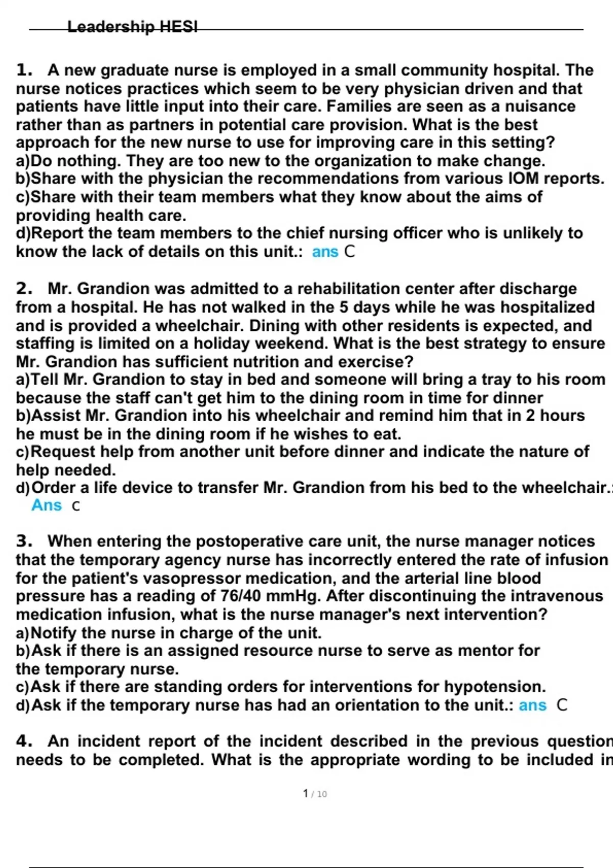 leadership hesi exam questions with correct answer