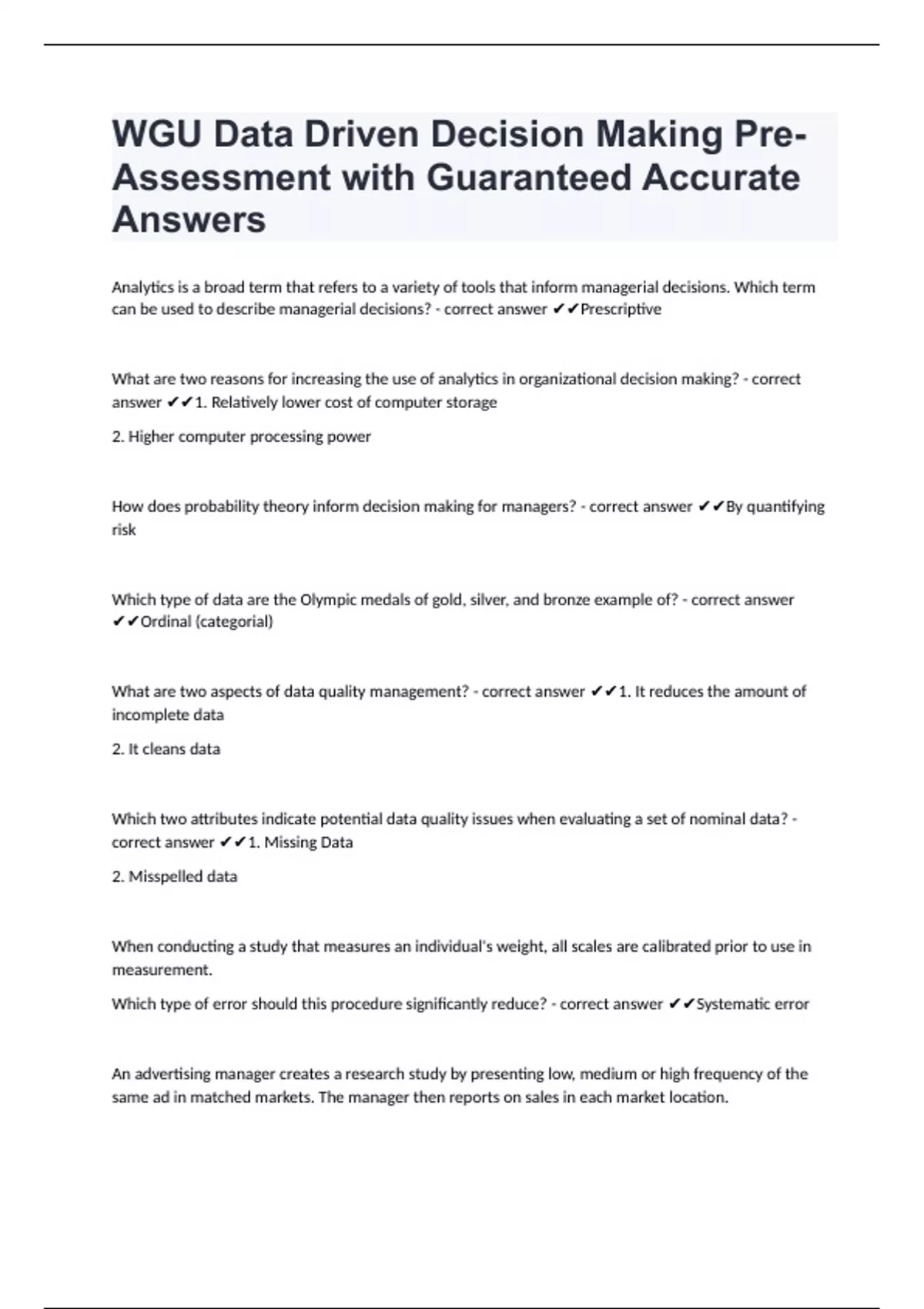 WGU Data Driven Decision Making Pre- Assessment with Guaranteed Accurate Answers
