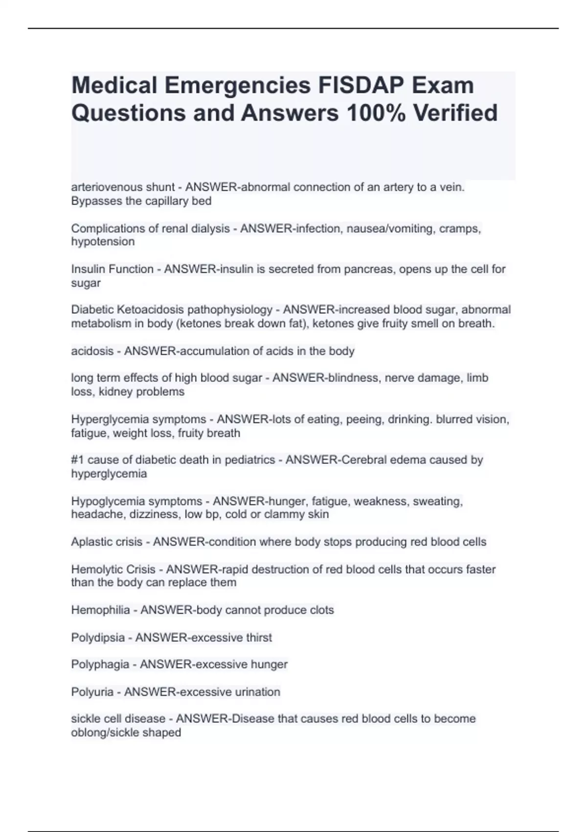 Complications of renal dialysis - ANSWER-infection, nausea/vomiting, cramps, hypotension Insulin Function - ANSWER-insulin is secreted from pancreas, opens up the cell for sugar Diabetic Ketoacidosis pathophysiology - ANSWER-increased blood sugar, abnormal metabolism in body (ketones break down fat), ketones give fruity smell on breath. acidosis - ANSWER-accumulation of acids in the body long term effects of high blood sugar - ANSWER-blindness, nerve damage, limb loss, kidney problems Hyperglycemia symptoms - ANSWER-lots of eating, peeing, drinking. blurred vision, fatigue, weight loss, fruity breath #1 cause of diabetic death in pediatrics - ANSWER-Cerebral edema caused by hyperglycemia Hypoglycemia symptoms - ANSWER-hunger, fatigue, weakness, sweating, headache, dizziness, low bp, cold or clammy skin Aplastic crisis - ANSWER-condition where body stops producing red blood cells Hemolytic Crisis - ANSWER-rapid destruction of red blood cells that occurs faster than the body can replace them Hemophilia - ANSWER-body cannot produce clots Polydipsia - ANSWER-excessive thirst Polyphagia - ANSWER-excessive hunger Polyuria - ANSWER-excessive urination sickle cell disease - ANSWER-Disease that causes red blood cells to become oblong/sickle shaped splenic sequestration crisis - ANSWER-Enlargement of spleen by sickle cells, cells get stuck in spleen and cause it to swell. Can be fatal Thrombophilia - ANSWER-tendency to develop blood clots Type 1 diabetes - ANSWER-body produces little or no insulin, usually occurs in childhood type 2 diabetes - ANSWER-body builds a resistance to insulin, occurs in adulthood