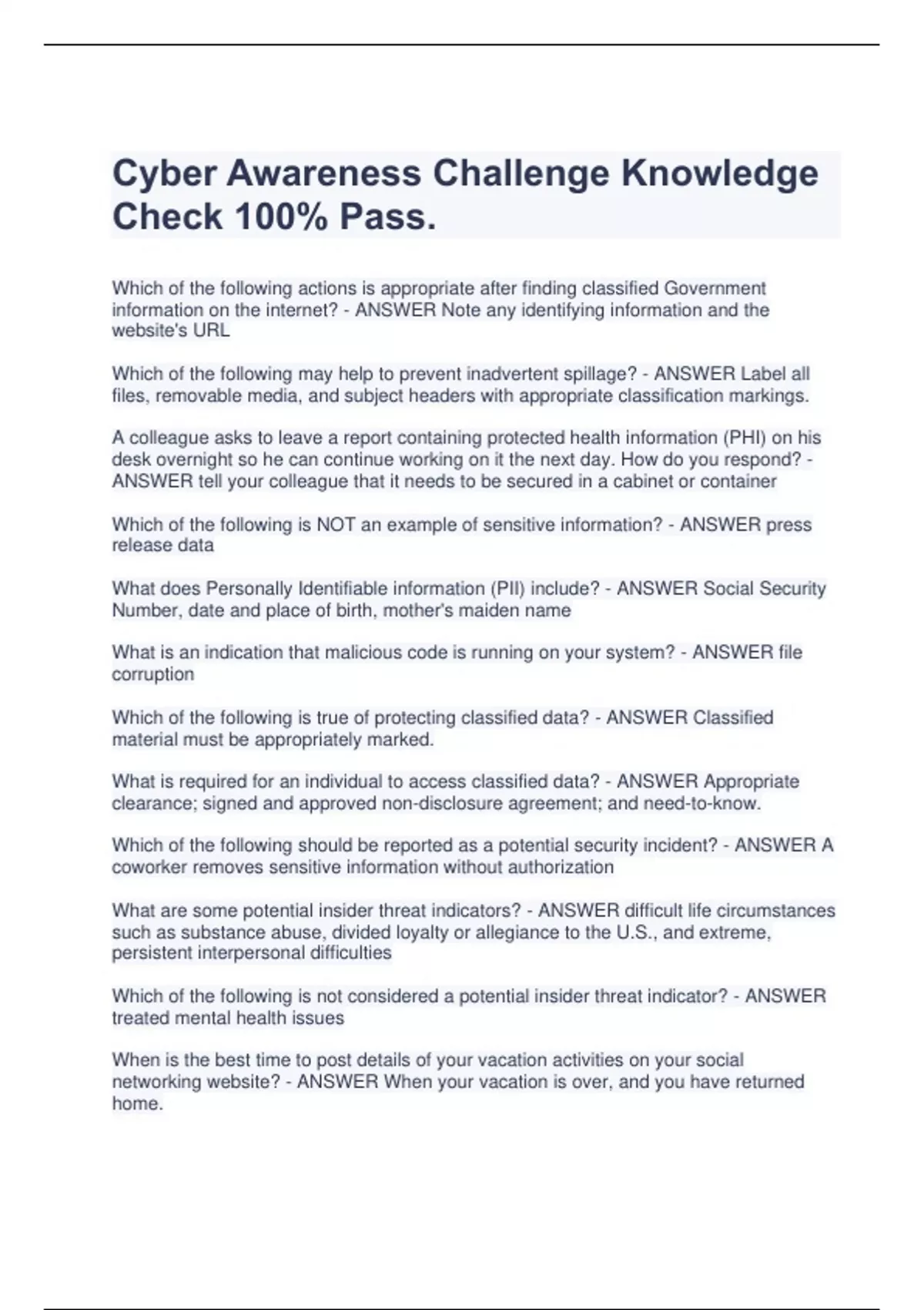 Cyber Awareness Challenge Knowledge Check 100% Pass. Which of the following actions is appropriate after finding classified Government information on the internet? - ANSWER Note any identifying information and the website's URL Which of the following may help to prevent inadvertent spillage? - ANSWER Label all files, removable media, and subject headers with appropriate classification markings. A colleague asks to leave a report containing protected health information (PHI) on his desk overnight so he can continue working on it the next day. How do you respond? - ANSWER tell your colleague that it needs to be secured in a cabinet or container Which of the following is NOT an example of sensitive information? - ANSWER press release data What does Personally Identifiable information (PII) include? - ANSWER Social Security Number, date and place of birth, mother's maiden name What is an indication that malicious code is running on your system? - ANSWER file corruption Which of the following is true of protecting classified data? - ANSWER Classified material must be appropriately marked. What is required for an individual to access classified data? - ANSWER Appropriate clearance; signed and approved non-disclosure agreement; and need-to-know. Which of the following should be reported as a potential security incident? - ANSWER A coworker removes sensitive information without authorization What are some potential insider threat indicators? - ANSWER difficult life circumstances such as substance abuse, divided loyalty or allegiance to the U.S., and extreme, persistent interpersonal difficulties Which of the following is not considered a potential insider threat indicator? - ANSWER treated mental health issues When is the best time to post details of your vacation activities on your social networking website? - ANSWER When your vacation is over, and you have returned home. Which of the following is a best practice to protect information about you and your organization on social networking sites and applications? - ANSWER Use only personal contact information when establishing personal social networking accounts, never use Government contact information. You have reached the office door to exit your controlled area. As a security best practice, what should you do before exiting? - ANSWER Remove your security badge, common access card (CAC), or personal identity verification (PIV) card. What certificates are contained on the Common Access Card (CAC)? - ANSWER Identification, encryption, and digital signature How should you protect your Common Access Card (CAC) or Personal Identity Verificatio
