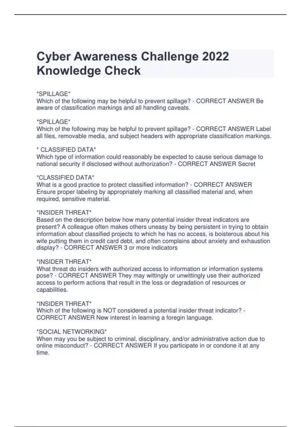 Cyber Awareness Knowledge Check Correct Answers 100% Guarantee Pass. How many potential insider threat indicators does a person who is married with two children, vacations at the beach every year, is pleasant to work with, but sometimes has poor work quality display? - correct answers 0 indicators What is the best response if you find classified government data on the internet? - correct answers Note any identifying information, such as the website's URL, and report the situation to your security POC. After reading an online story about a new security project being developed on the military installation where you work, your neighbor asks you to comment about the article. You know this project is classified. What should be your response? - correct answers Attempt to change the subject to something non-work related, but neither confirm nor deny the article's authenticity. What is a proper response if spillage occurs? - correct answers Immediately notify your security POC. What should you do if a reporter asks you about potentially classified information on the web? - correct answers Ask for information about the website, including the URL. A user writes down details from a report stored on a classified system marked as Secret and uses those details to draft an unclassified briefing on an unclassified system without authorization. What is the best choice to describe what has occurred? - correct answers Spillage because classified data was moved to a lower classification level system without authorization. How many potential insider threat indicators does a coworker who often makes others uneasy by being persistent in trying to obtain information about classified projects to which he has no access, is boisterous about his wife putting them in credit card debt, and often complains about anxiety and exhaustion display? - correct answers 3 or more indicators Which of the following can an unauthorized disclosure of information classified as Confidential reasonably be expected to cause? - correct answers Damage to national security Which classification level is given to information that could reasonably be expected to cause serious damage to national security? - correct answers Secret When classified data is not in use, how can you protect it? - correct answers Store classified data appropriately in a GSA-approved vault/container when not in use. Which is a good practice to protect classified information? - correct answers Ensure proper labeling by appropriately marking all classified material and, when required, sensitive material. Which of the following is a good practice to aid in preventing spillage? - correct answers Be aware of classification markings and all handling caveats. What is required for an individual to access classified data? - correct answers Appropriate clearance; signed and approved non-disclosure agreement; and need-toknow. What type of activity or behavior should be reported as a potential insider threat? - correct answers Coworker making consistent statements indicative of hostility or anger toward the United States and its policies. Which of the following practices reduces the chance of becoming a target by adversaries seeking insider information? - correct answers Don't talk about work outside your workspace unless it is a specifically designated public meeting environment and is controlled by the event planners. Which scenario might indicate a reportable insider threat security incident? - correct answers A coworker is observed using a personal electronic device in an area where their use is prohibited. Why might "insiders" be able to cause damage to their organizations more easily than others? - correct answers Insiders are given a level of trust and have authorized access to Government information systems. Which of the following is a best practice to protect information about you and your organization on social networking sites and applications? - correct answers Use only personal contact information when establishing personal social networking accounts, never use Government contact information. What should you do if an individual asks you to let her follow you into your controlled space, stating that she left her security badge at her desk? - correct answers Don't allow her access into secure areas and report suspicious activity. Which represents a security best practice when using social networking? - correct answers Understanding and using available privacy settings. Which is NOT a sufficient way to protect your identity? - correct answers Use a common password for all your system and application logons. Under which circumstances may you be subject to criminal, disciplinary, and/or administrative action due to online misconduct? - correct answers Any time you participate in or condone misconduct, whether offline or online. As someone who works with classified information, what should you do if you are contacted by a foreign national seeking information on a research project? - correct answers Inform your security POC of all non-professional or non-routine contacts with foreign nations, including, but not limited to, joining each other's social media sites. Which of the following is true about unclassified data? - correct answers When unclassified data is aggregated, its classification level may rise. What are some potential insider threat indicators? - correct answers Difficult life circumstances such as substance abuse; divided loy