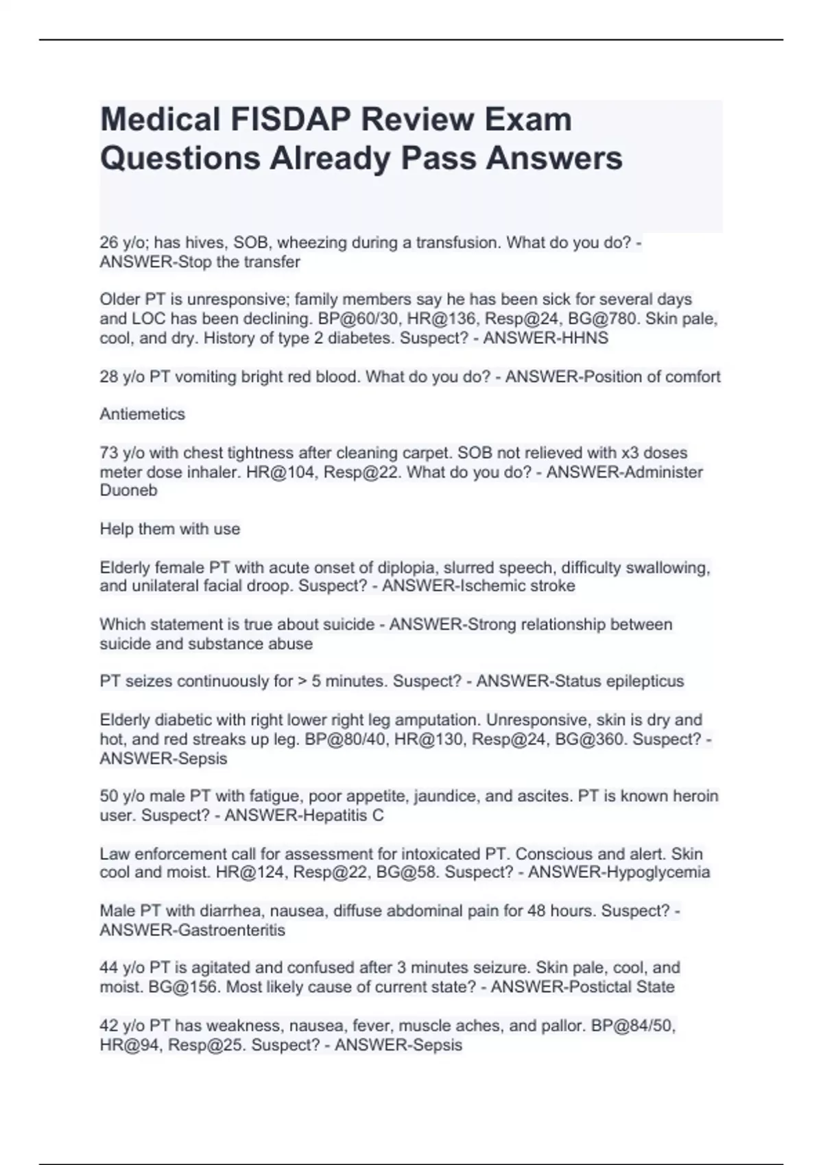 Older PT is unresponsive; family members say he has been sick for several days and LOC has been declining. BP@60/30, HR@136, Resp@24, BG@780. Skin pale, cool, and dry. History of type 2 diabetes. Suspect? - ANSWER-HHNS 28 y/o PT vomiting bright red blood. What do you do? - ANSWER-Position of comfort Antiemetics 73 y/o with chest tightness after cleaning carpet. SOB not relieved with x3 doses meter dose inhaler. HR@104, Resp@22. What do you do? - ANSWER-Administer Duoneb Help them with use Elderly female PT with acute onset of diplopia, slurred speech, difficulty swallowing, and unilateral facial droop. Suspect? - ANSWER-Ischemic stroke Which statement is true about suicide - ANSWER-Strong relationship between suicide and substance abuse PT seizes continuously for 5 minutes. Suspect? - ANSWER-Status epilepticus Elderly diabetic with right lower right leg amputation. Unresponsive, skin is dry and hot, and red streaks up leg. BP@80/40, HR@130, Resp@24, BG@360. Suspect? - ANSWER-Sepsis 50 y/o male PT with fatigue, poor appetite, jaundice, and ascites. PT is known heroin user. Suspect? - ANSWER-Hepatitis C Law enforcement call for assessment for intoxicated PT. Conscious and alert. Skin cool and moist. HR@124, Resp@22, BG@58. Suspect? - ANSWER-Hypoglycemia Male PT with diarrhea, nausea, diffuse abdominal pain for 48 hours. Suspect? - ANSWER-Gastroenteritis 44 y/o PT is agitated and confused after 3 minutes seizure. Skin pale, cool, and moist. BG@156. Most likely cause of current state? - ANSWER-Postictal State 42 y/o PT has weakness, nausea, fever, muscle aches, and pallor. BP@84/50, HR@94, Resp@25. Suspect? - ANSWER-Sepsis Why is the immediate transport of a sickle cell PT important? - ANSWER-Situation may require blood transfusion Life threatening emergency ~ Ricky anser What buffer is used to maintain acid/base symmetry in blood - ANSWER-Bicarbonate Guy found lying on side of home. Lethargic, pale, cool and dry. Wife says he is an alcoholic. PT vomiting coffee-ground emesis. BP@66/42, HR@130. What should you administer? - ANSWER-Give fluids ASAP 20ml per KG