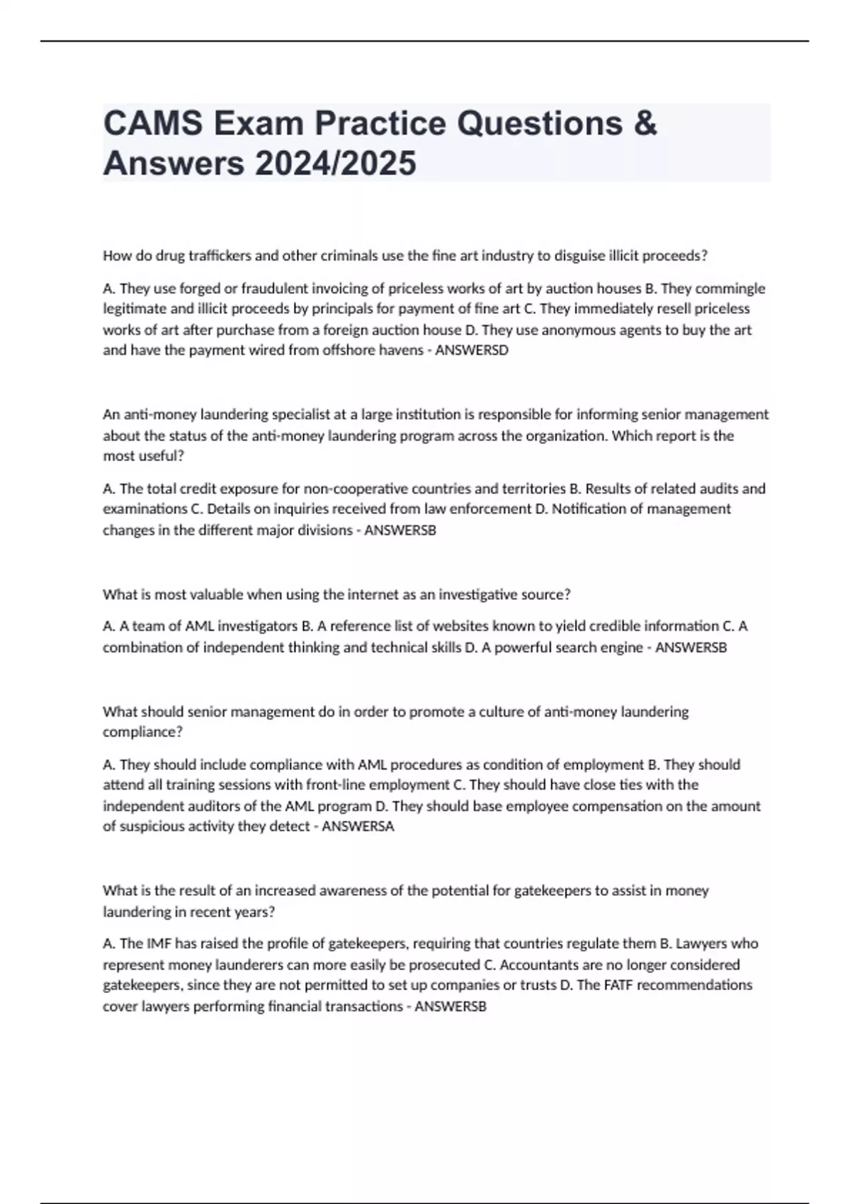 CAMS Exam Practice Questions & Answers 2024/2025 How do drug traffickers and other criminals use the fine art industry to disguise illicit proceeds? A. They use forged or fraudulent invoicing of priceless works of art by auction houses B. They commingle legitimate and illicit proceeds by principals for payment of fine art C. They immediately resell priceless works of art after purchase from a foreign auction house D. They use anonymous agents to buy the art and have the payment wired from offshore havens - ANSWERSD An anti-money laundering specialist at a large institution is responsible for informing senior management about the status of the anti-money laundering program across the organization. Which report is the most useful? A. The total credit exposure for non-cooperative countries and territories B. Results of related audits and examinations C. Details on inquiries received from law enforcement D. Notification of management changes in the different major divisions - ANSWERSB What is most valuable when using the internet as an investigative source? A. A team of AML investigators B. A reference list of websites known to yield credible information C. A combination of independent thinking and technical skills D. A powerful search engine - ANSWERSB What should senior management do in order to promote a culture of anti-money laundering compliance? A. They should include compliance with AML procedures as condition of employment B. They should attend all training sessions with front-line employment C. They should have close ties with the independent auditors of the AML program D. They should base employee compensation on the amount of suspicious activity they detect - ANSWERSA What is the result of an increased awareness of the potential for gatekeepers to assist in money laundering in recent years? A. The IMF has raised the profile of gatekeepers, requiring that countries regulate them B. Lawyers who represent money launderers can more easily be prosecuted C. Accountants are no longer considered gatekeepers, since they are not permitted to set up companies or trusts D. The FATF recommendations cover lawyers performing financial transactions - ANSWERSB