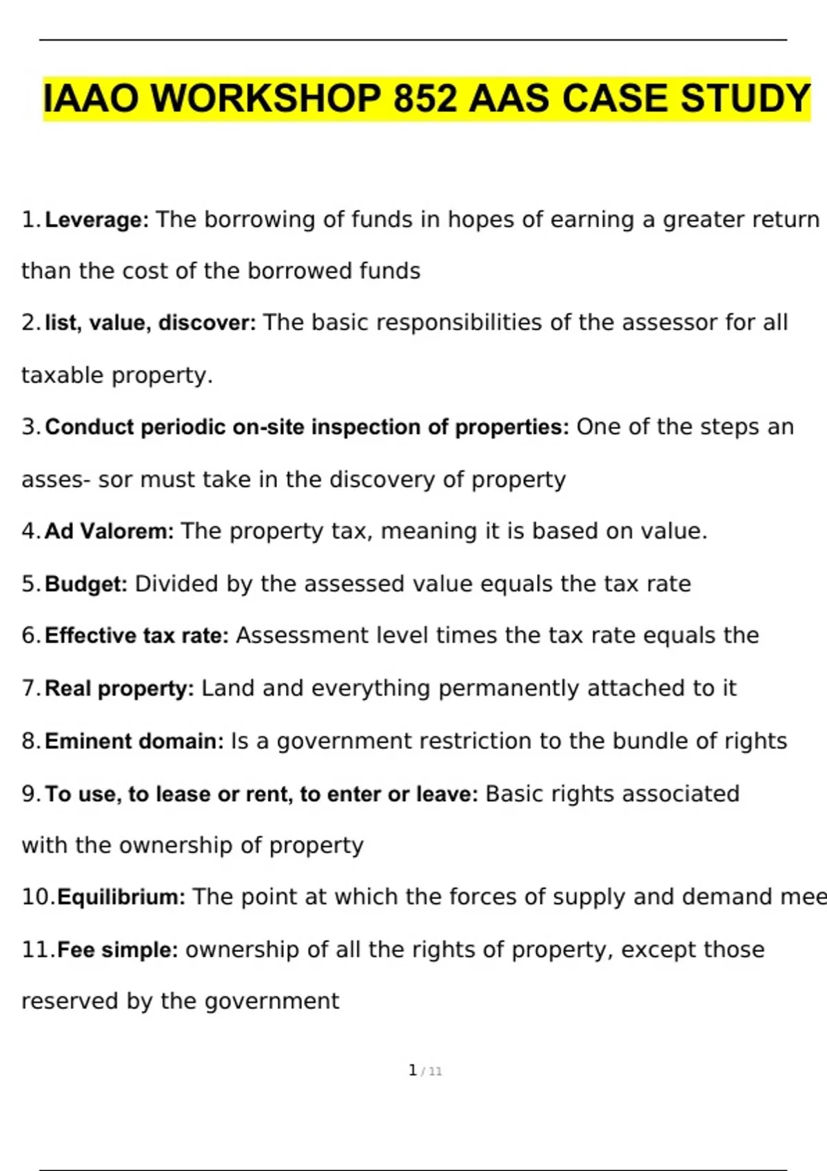 IAAO Workshop 852 AAS Case Study (2024/2025) Updated | Download to score A+.Leverage The borrowing of funds in hopes of earning a greater return than the cost of the borrowed funds list, value, discover The basic responsibilities of the assessor for all taxable property. Conduct periodic on-site inspection of properties One of the steps an assessor must take in the discovery of property Ad Valorem The property tax, meaning it is based on value. Budget Divided by the assessed value equals the tax rate Effective tax rate Assessment level times the tax rate equals the Real property Land and everything permanently attached to it Eminent domain Is a government restriction to the bundle of rights