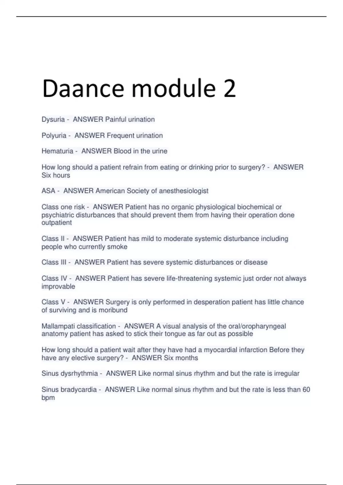 Daance module 2 Dysuria - ANSWER Painful urination Polyuria - ANSWER Frequent urination Hematuria - ANSWER Blood in the urine How long should a patient refrain from eating or drinking prior to surgery? - ANSWER Six hours ASA - ANSWER American Society of anesthesiologist Class one risk - ANSWER Patient has no organic physiological biochemical or psychiatric disturbances that should prevent them from having their operation done outpatient Class II - ANSWER Patient has mild to moderate systemic disturbance including people who currently smoke Class III - ANSWER Patient has severe systemic disturbances or disease Class IV - ANSWER Patient has severe life-threatening systemic just order not always improvable Class V - ANSWER Surgery is only performed in desperation patient has little chance of surviving and is moribund Mallampati classification - ANSWER A visual analysis of the oral/oropharyngeal anatomy patient has asked to stick their tongue as far out as possible How long should a patient wait after they have had a myocardial infarction Before they have any elective surgery? - ANSWER Six months Sinus dysrhythmia - ANSWER Like normal sinus rhythm and but the rate is irregular Sinus bradycardia - ANSWER Like normal sinus rhythm and but the rate is less than 60 bpm Sinus tachycardia - ANSWER Normal sinus rhythm except the rate is over 100 bpm PAC premature atrial contraction - ANSWER A short beat containing the PAC is usually followed by a longer be containing what is termed a compensatory pause it represents as an isolated firing of an act topic focus in the atria prior to the regular firing of the SA node Supra ventricular tachycardia - ANSWER Regular narrow complex tachycardia with the rate of 150 to 250 bpm Atrial fibrillation - ANSWER There are rapid deflections of the baseline but no P waves Atrial flutter - ANSWER There are usually several flutter waves preceding each QRS often in a ratio of three or four F waves per QRS Possible causes for atrial flutter - ANSWER Valvular heart disease, acute MI, hypertension, congestive heart failure, or pulmonary disease. Three or more PVCs is considered the onset of what? - ANSWER Ventricular tachycardia Ventricular tachycardia - ANSWER There is a wide blunt wrap and waveform with no discernible he or T wave