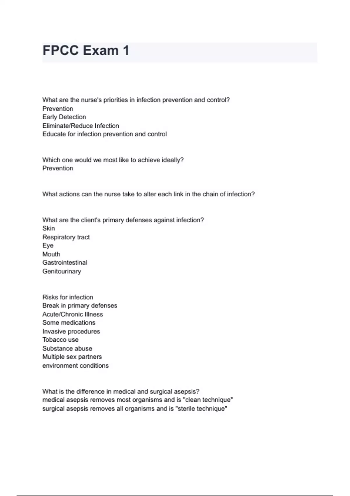 FPCC Exam 1 Questions And Answers What are the nurse's priorities in infection prevention and control? Prevention Early Detection Eliminate/Reduce Infection Educate for infection prevention and control Which one would we most like to achieve ideally? Prevention What actions can the nurse take to alter each link in the chain of infection? What are the client's primary defenses against infection? Skin Respiratory tract Eye Mouth Gastrointestinal Genitourinary Risks for infection Break in primary defenses Acute/Chronic Illness Some medications Invasive procedures Tobacco use Substance abuse Multiple sex partners environment conditions What is the difference in medical and surgical asepsis? medical asepsis removes most organisms and is "clean technique" surgical asepsis removes all organisms and is "sterile technique"