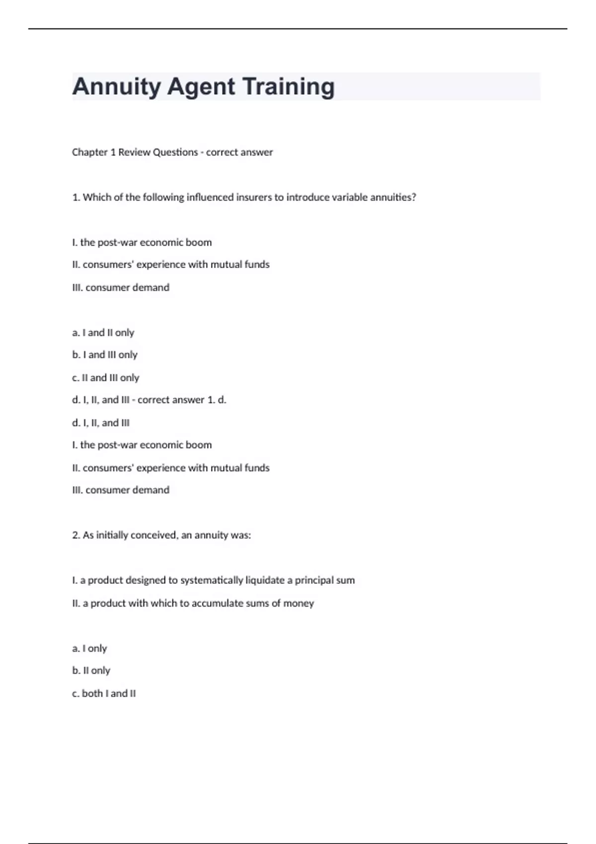 Annuity Agent TrainingChapter 1 Review Questions - correct answer 1. Which of the following influenced insurers to introduce variable annuities? I. the post-war economic boom II. consumers' experience with mutual funds III. consumer demand a. I and II only b. I and III only c. II and III only d. I, II, and III - correct answer 1. d. d. I, II, and III I. the post-war economic boom II. consumers' experience with mutual funds III. consumer demand