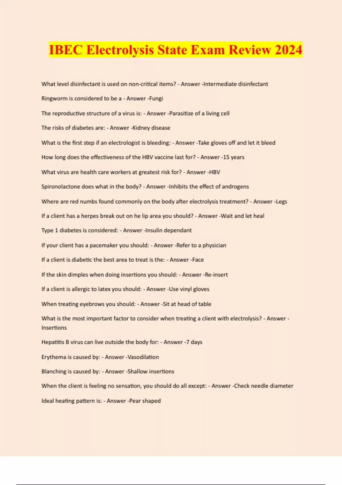 IBEC Electrolysis State Exam Review 2024 What level disinfectant is used on non-critical items? - Answer -Intermediate disinfectant Ringworm is considered to be a - Answer -Fungi The reproductive structure of a virus is: - Answer -Parasitize of a living cell The risks of diabetes are: - Answer -Kidney disease What is the first step if an electrologist is bleeding: - Answer -Take gloves off and let it bleed How long does the effectiveness of the HBV vaccine last for? - Answer -15 years What virus are health care workers at greatest risk for? - Answer -HBV Spironolactone does what in the body? - Answer -Inhibits the effect of androgens Where are red numbs found commonly on the body after electrolysis treatment? - Answer -Legs If a client has a herpes break out on he lip area you should? - Answer -Wait and let heal Type 1 diabetes is considered: - Answer -Insulin dependant If your client has a pacemaker you should: - Answer -Refer to a physician If a client is diabetic the best area to treat is the: - Answer -Face If the skin dimples when doing insertions you should: - Answer -Re-insert If a client is allergic to latex you should: - Answer -Use vinyl gloves When treating eyebrows you should: - Answer -Sit at head of tabl