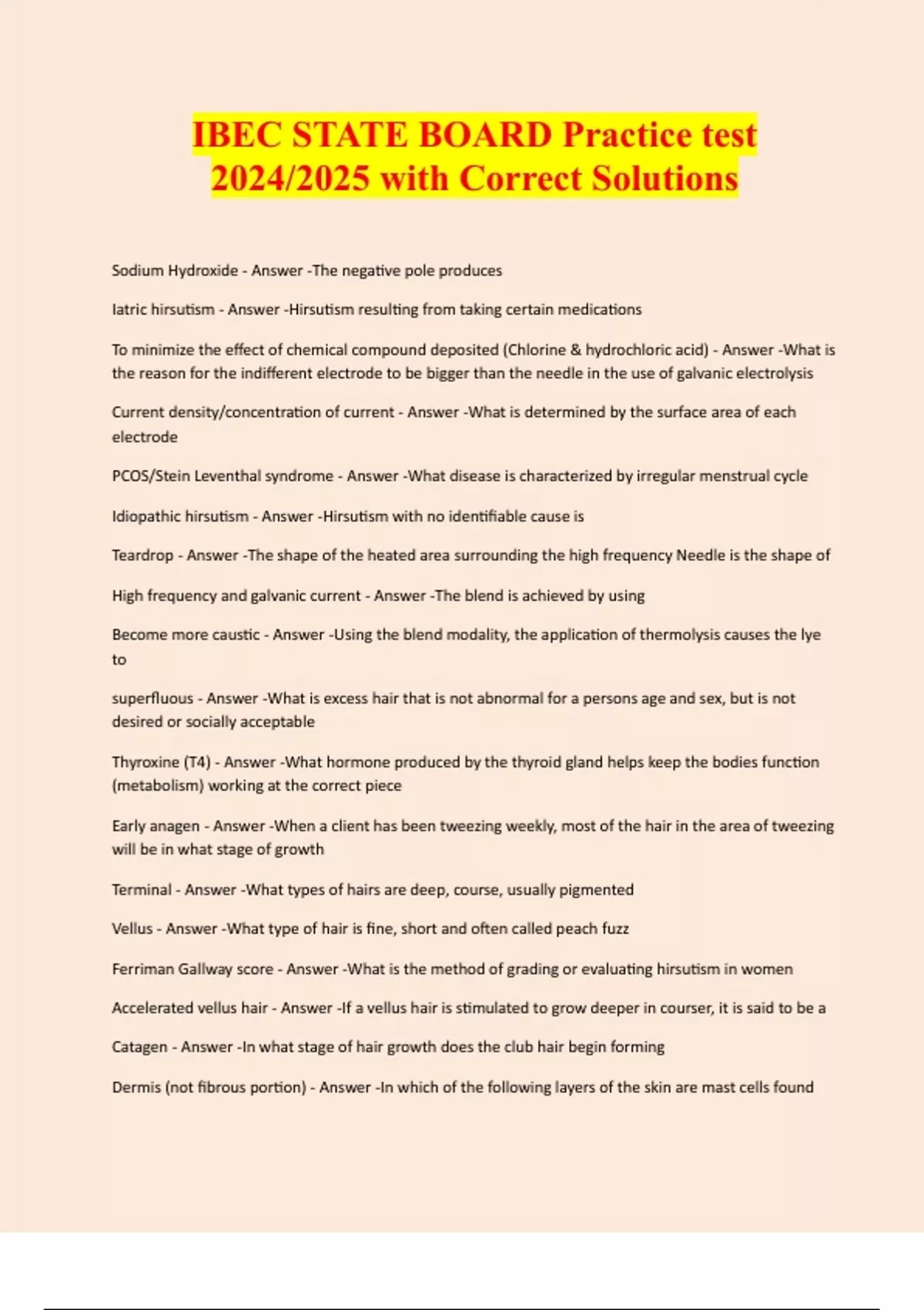 IBEC STATE BOARD Practice test 2024/2025 with Correct Solutions Sodium Hydroxide - Answer -The negative pole produces Iatric hirsutism - Answer -Hirsutism resulting from taking certain medications To minimize the effect of chemical compound deposited (Chlorine & hydrochloric acid) - Answer -What is the reason for the indifferent electrode to be bigger than the needle in the use of galvanic electrolysis Current density/concentration of current - Answer -What is determined by the surface area of each electrode PCOS/Stein Leventhal syndrome - Answer -What disease is characterized by irregular menstrual cycle Idiopathic hirsutism - Answer -Hirsutism with no identifiable cause is Teardrop - Answer -The shape of the heated area surrounding the high frequency Needle is the shape of High frequency and galvanic current - Answer -The blend is achieved by using Become more caustic - Answer -Using the blend modality, the application of thermolysis causes the lye to superfluous - Answer -What is excess hair that is not abnormal for a persons age and sex, but is not desired or socially acceptable Thyroxine (T4) - Answer -What hormone produced by the thyroid gland helps keep the bodies function (metabolism) working at the correct piece Early anagen - Answer -When a client has been tweezing weekly, most of the hair in the area of tweezing will be in what stage of growth Terminal - Answer -What types of hairs are deep, course, usually pigmented Vellus - Answer -What type of hair is fine, short and often called peach fuzz Ferriman Gallway score - Answer -What is the method of grading or evaluating hirsutism in women Accelerated vellus hair - Answer -If a vellus hair is stimulated to grow deeper in courser, it is said to be a Catagen - Answer -In what stage of hair growth does the club hair begin forming Dermis (not fibrous portion) - Answer -In which of the following layers of the skin are mast cells foundLH (luteinizing hormone) - Answer -Which of the following hormones will cause hirsutism Delayed healing time - Answer -When treating a client with diabetes what is of the greatest concern Adrenal gland - Answer -Which gland is most associated with hair growth Edema - Answer -The build up of interstitial fluid between cells in the skin is Polycystic ovaries - Answer -Which of the following is the most common cause hirsutism and menstrual irregularity in women less than 50 years of age Carotene, blood vessels and melanin - Answer -What contributes to the color of the skin Skin, hair, eyes - Answer -Where do you find melanin Epidermis: Stratum Lucidum - Answer -In which layer of the skin is eleidin found Spinosum - Answer -What is the prickle cell lay
