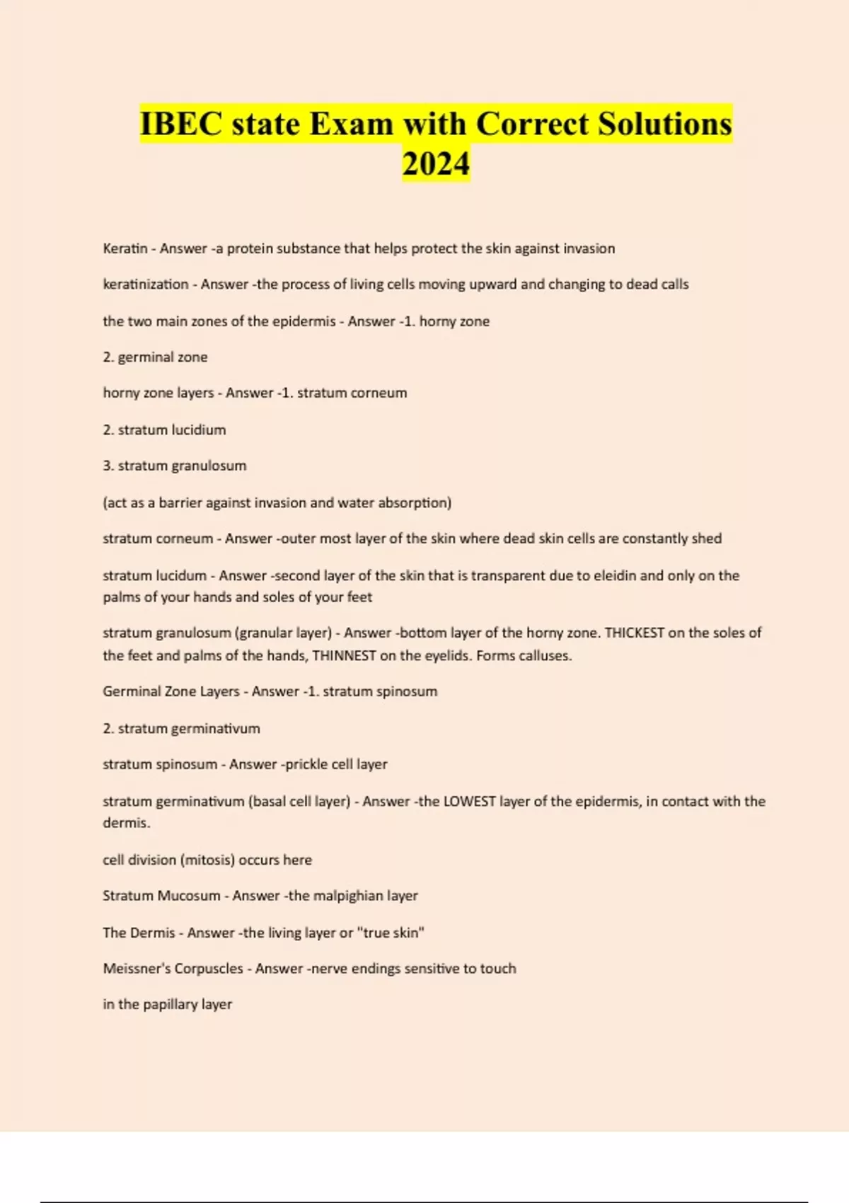 IBEC state Exam with Correct Solutions 2024 Keratin - Answer -a protein substance that helps protect the skin against invasion keratinization - Answer -the process of living cells moving upward and changing to dead calls the two main zones of the epidermis - Answer -1. horny zone 2. germinal zone horny zone layers - Answer -1. stratum corneum 2. stratum lucidium 3. stratum granulosum (act as a barrier against invasion and water absorption) stratum corneum - Answer -outer most layer of the skin where dead skin cells are constantly shed stratum lucidum - Answer -second layer of the skin that is transparent due to eleidin and only on the palms of your hands and soles of your feet stratum granulosum (granular layer) - Answer -bottom layer of the horny zone. THICKEST on the soles of the feet and palms of the hands, THINNEST on the eyelids. Forms calluses. Germinal Zone Layers - Answer -1. stratum spinosum 2. stratum germinativum stratum spinosum - Answer -prickle cell layer stratum germinativum (basal cell layer) - Answer -the LOWEST layer of the epidermis, in contact with the dermis. cell division (mitosis) occurs here Stratum Mucosum - Answer -the malpighian layer The Dermis - Answer -the living layer or "true skin" Meissner's Corpuscles - Answer -nerve endings sensitive to touch in the papillary layerThe Reticular Layer - Answer -the THICKEST layer of the skin made of collagen fibers Appendages of the Reticular layer - Answer -arrector pili muscles blood vessels fat cells hair follicles lymph vessels nerve endings sebaceous glads- oil sudoriferous glands- sweat As the blood supply circulates through the skin it... - Answer -transports the oxygen-rich blood and nutrients essential for growth; reproduction; and tissue repair of the skin, hair, and nails