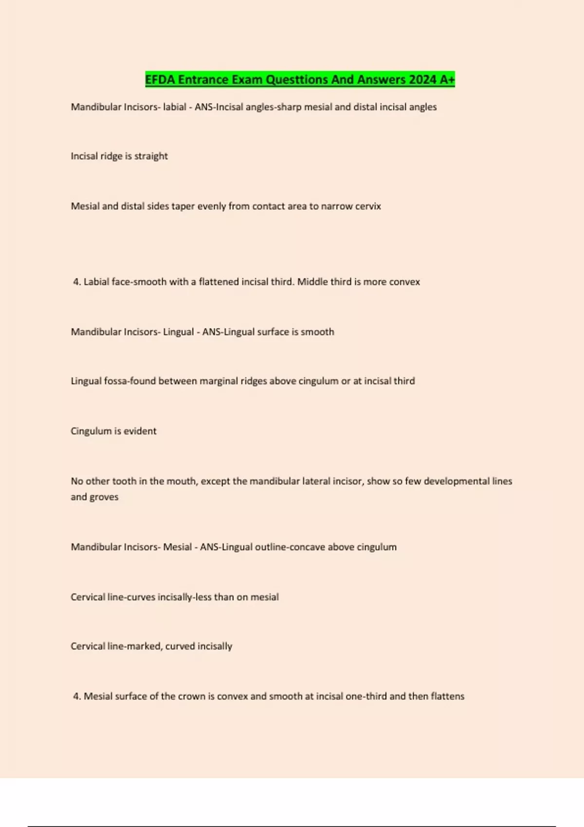 EFDA Entrance Exam Questtions And Answers 2024 A+ Mandibular Incisors- labial - ANS-Incisal angles-sharp mesial and distal incisal angles Incisal ridge is straight Mesial and distal sides taper evenly from contact area to narrow cervix 4. Labial face-smooth with a flattened incisal third. Middle third is more convex Mandibular Incisors- Lingual - ANS-Lingual surface is smooth Lingual fossa-found between marginal ridges above cingulum or at incisal third Cingulum is evident No other tooth in the mouth, except the mandibular lateral incisor, show so few developmental lines and groves Mandibular Incisors- Mesial - ANS-Lingual outline-concave above cingulum Cervical line-curves incisally-less than on mesial Cervical line-marked, curved incisally 4. Mesial surface of the crown is convex and smooth at incisal one-third and then flattens Mandibular Incisors- Distal - ANS-Cervical line-curves incisally-less than on mesial Distal surface is similar to the mesial surfaces Mandibular Incisors- Incisal - ANS-Incisal edge-almost at right angle to line bisecting crown labiolingually 2. Labial surface-see more than lingual surface Mand lateral incisors- labial - ANS-Tooth is asymmetrical-right side (M) does not match the left (D) side of lateral Lateral incisor is somewhat larger than the mandibular central (exact opposite of maxillary incisors) Mesial side is somewhat longer than the distal side-slopes downwards somewhat Incisal ridge-slopes downward in a distal direction Crown is somewhat longer than mandibular central incisor Mesial Surface and Distal Surface Mand Lateral incisors- lingual - ANS-