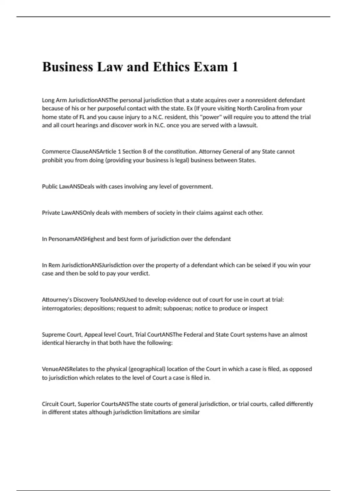 Business Law and Ethics Exam 1 Questions and Answers 2024 Latest Edition