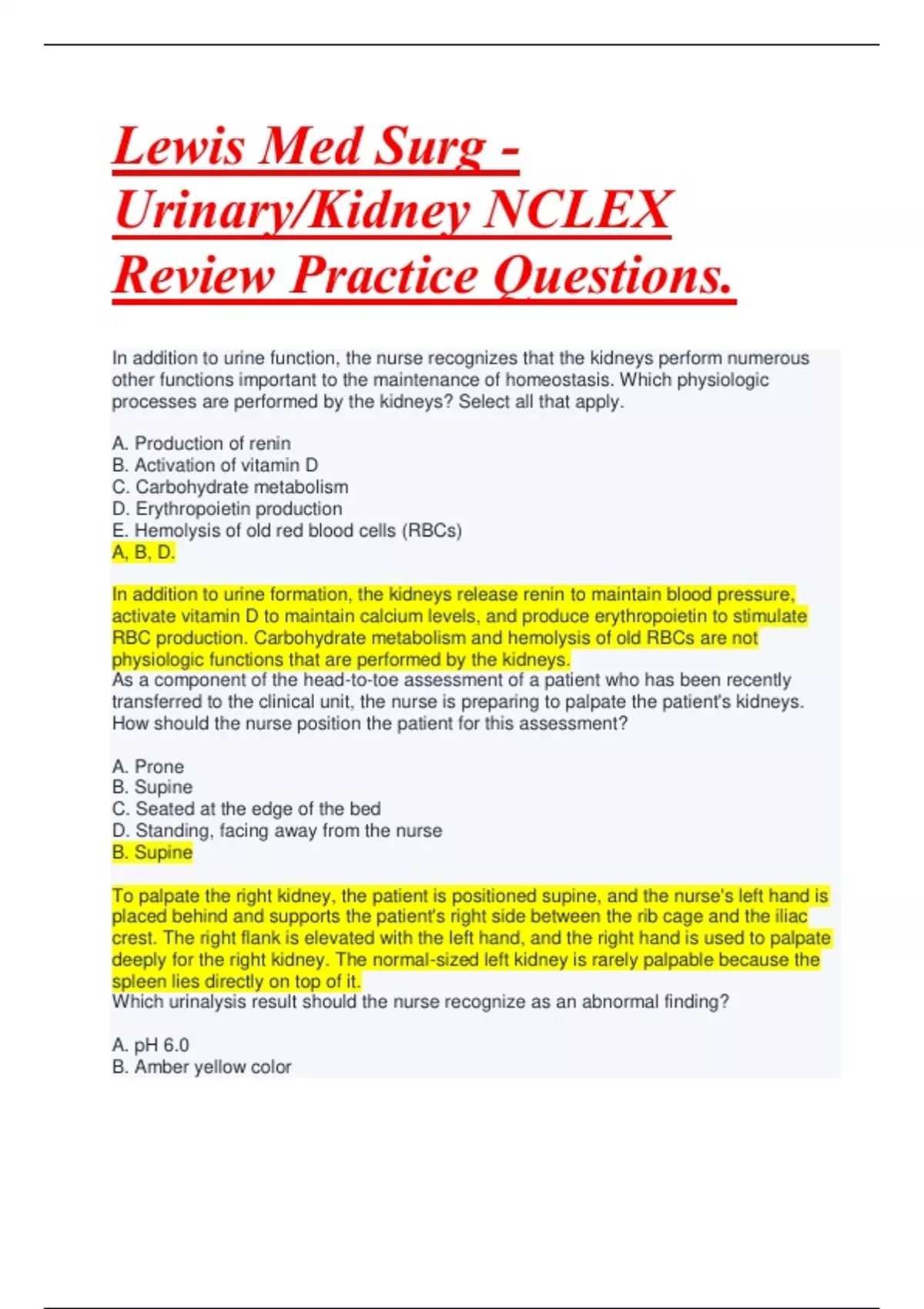 As a component of the head-to-toe assessment of a patient who has been recently transferred to the clinical unit, the nurse is preparing to palpate the patient's kidneys. How should the nurse position the patient for this assessment? A. Prone B. Supine C. Seated at the edge of the bed D. Standing, facing away from the nurse B. Supine To palpate the right kidney, the patient is positioned supine, and the nurse's left hand is placed behind and supports the patient's right side between the rib cage and the iliac crest. The right flank is elevated with the left hand, and the right hand is used to palpate deeply for the right kidney. The normal-sized left kidney is rarely palpable because the spleen lies directly on top of it. Which urinalysis result should the nurse recognize as an abnormal finding? A. pH 6.0 B. Amber yellow color