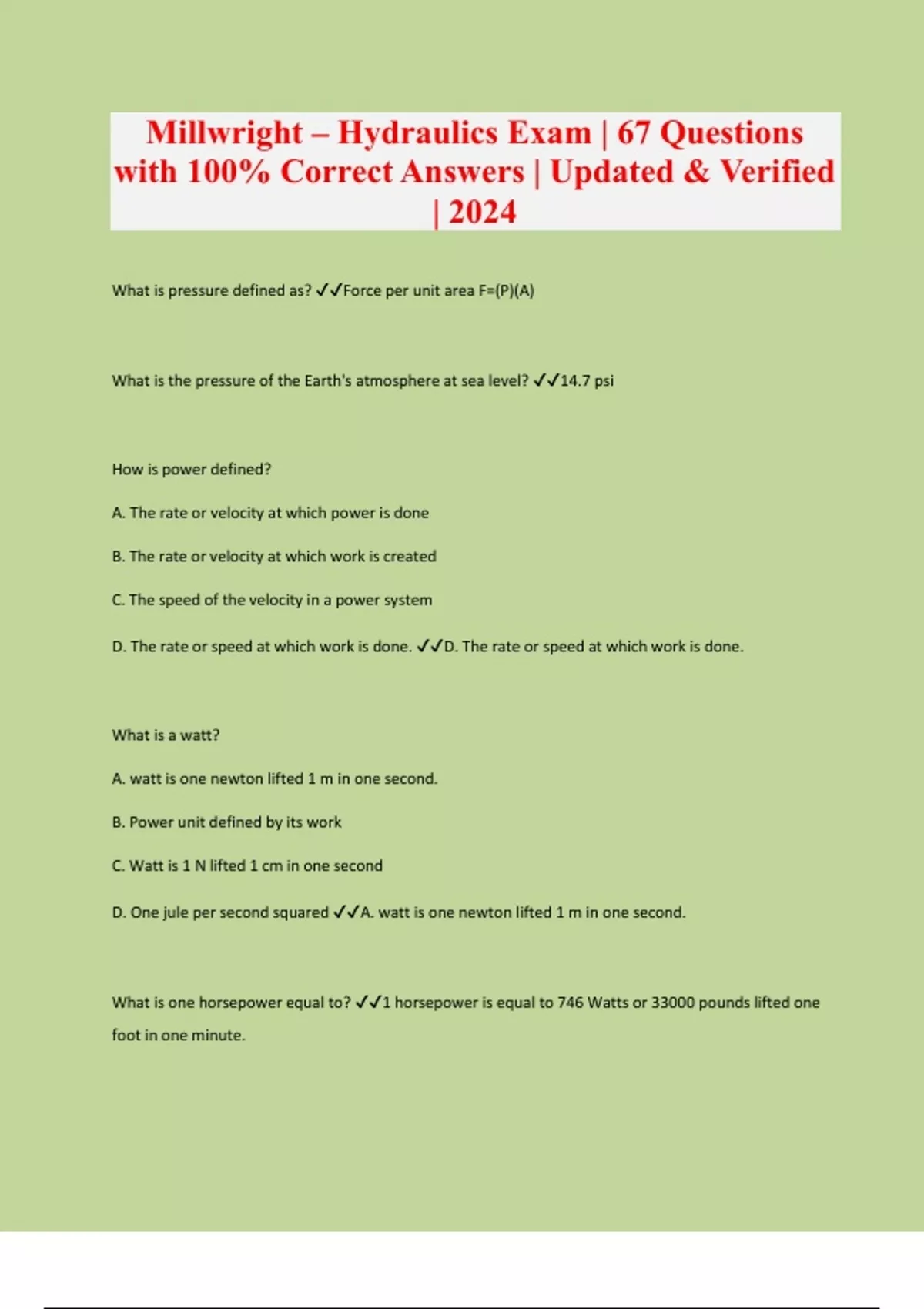 What is pressure defined as? Force per unit area F=(P)(A) What is the pressure of the Earth's atmosphere at sea level? 14.7 psi How is power defined? A. The rate or velocity at which power is done B. The rate or velocity at which work is created C. The speed of the velocity in a power system D. The rate or speed at which work is done. D. The rate or speed at which work is done. What is a watt? A. watt is one newton lifted 1 m in one second. B. Power unit defined by its work C. Watt is 1 N lifted 1 cm in one second D. One jule per second squared A. watt is one newton lifted 1 m in one second. What is one horsepower equal to? 1 horsepower is equal to 746 Watts or 33000 pounds lifted one foot in one minute.What is the law of conservation of energy? A. Energy cannot be destroyed, but it may be created from one form to another. B. Energy cannot be destroyed, but it may be converted from one form to another. C. Energy can be destroyed, but cant be converted from one form to another D. Energy cannot be destroyed, but it may be transformed to another form of power B. Energy cannot be destroyed, but it may be converted from one form to another. How much does hydraulic fluid compress? A. Hydraulic fluid compresses about 0.5% at 10000 psi. B. Hydraulic fluid compresses about 0.5% at 1000 psi. C. Hydraulic fluid compresses about 0.5% at 1000 kPa. D. Hydraulic fluid compresses about 0.15% at 1000 psi.