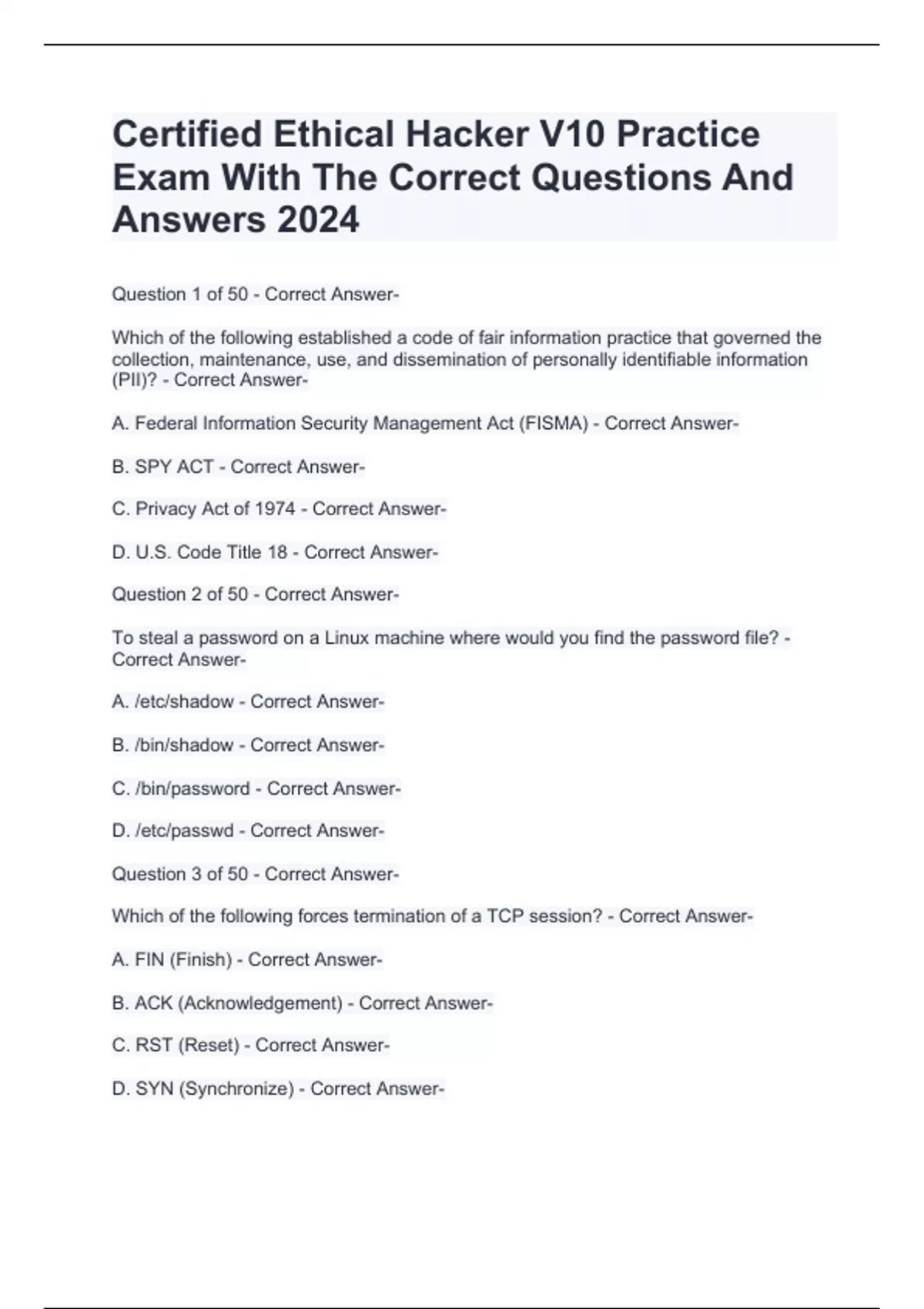 Certified Ethical Hacker V10 Practice Exam With The Correct Questions And Answers 2024