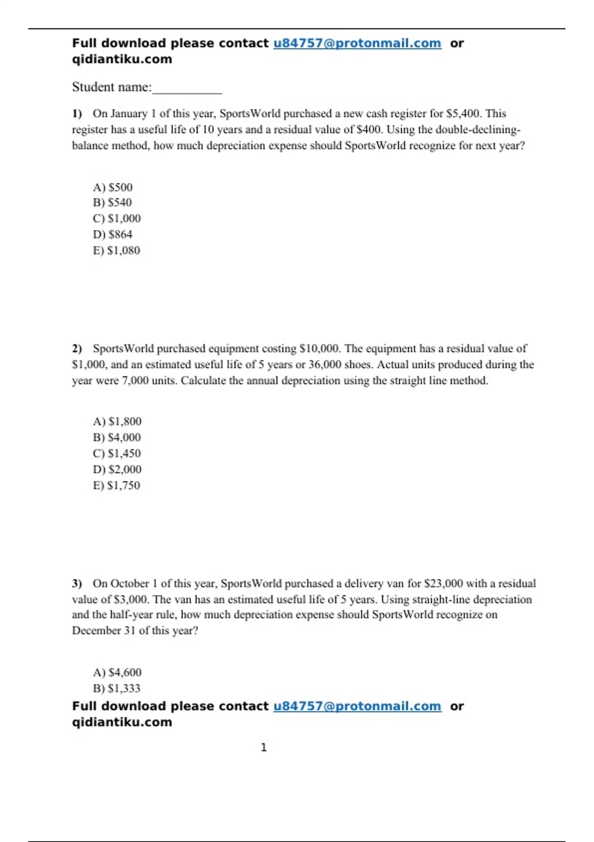 2) SportsWorld purchased equipment costing $10,000. The equipment has a residual value of