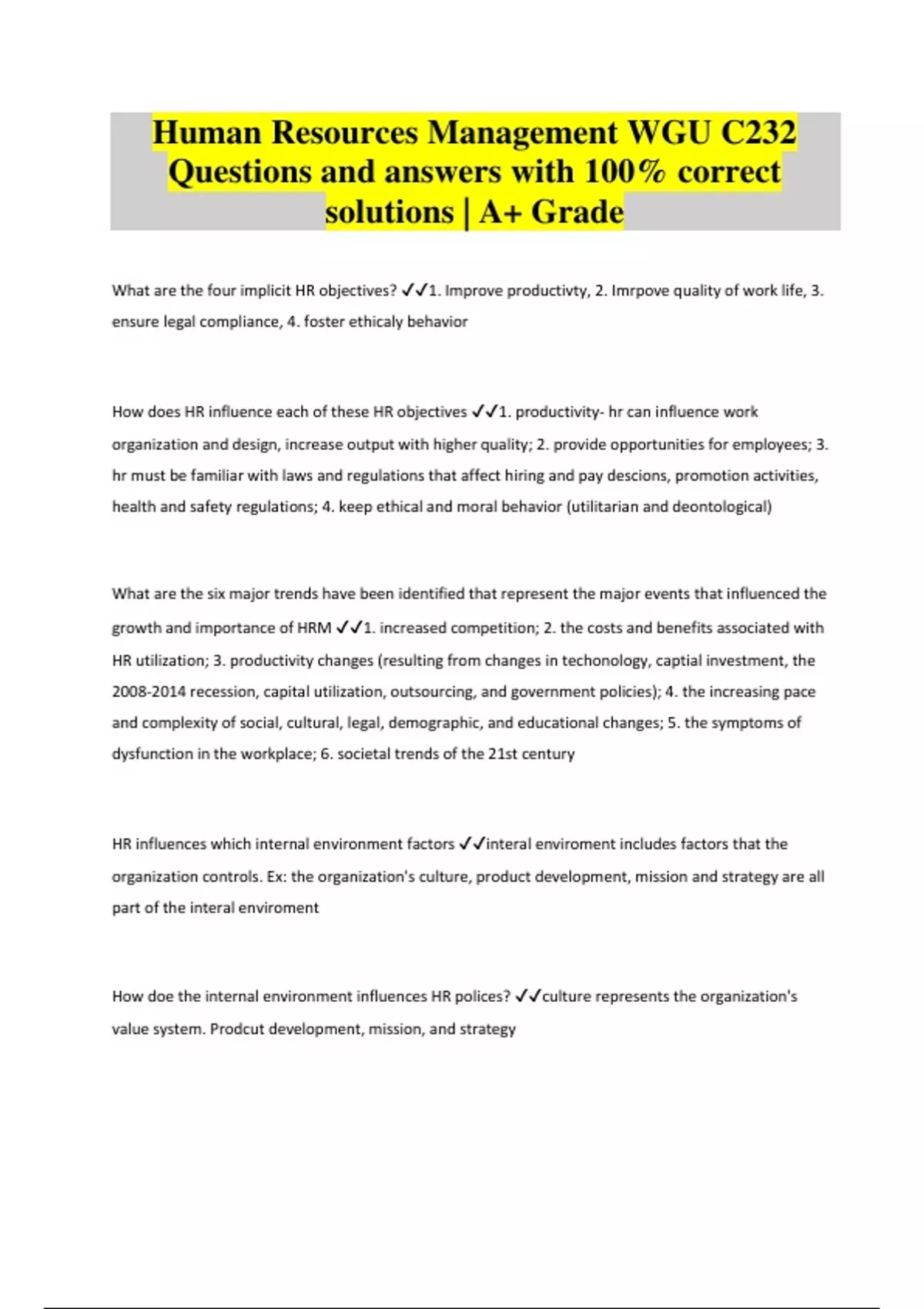 Human Resources Management WGU C232 Questions and answers with 100% correct solutions | A+ Grade