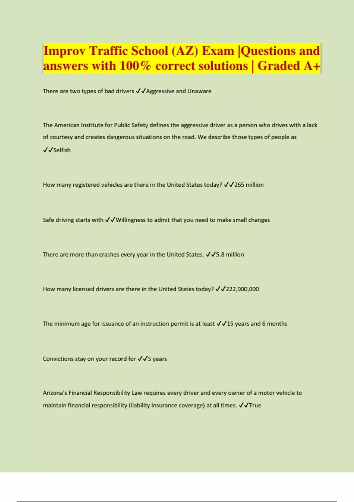 Improv Traffic School (AZ) Exam |Questions and answers with 100% correct solutions | Graded A+