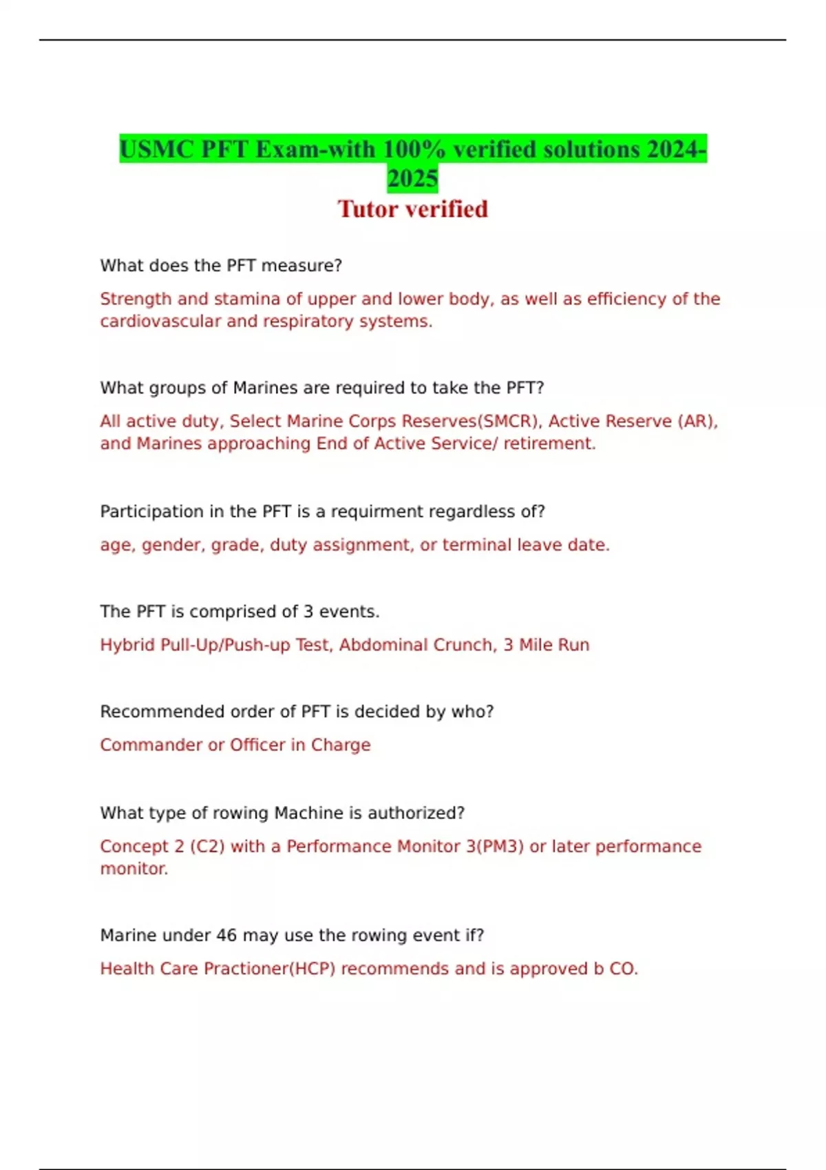 USMC PFT Exam-with 100% verified solutions