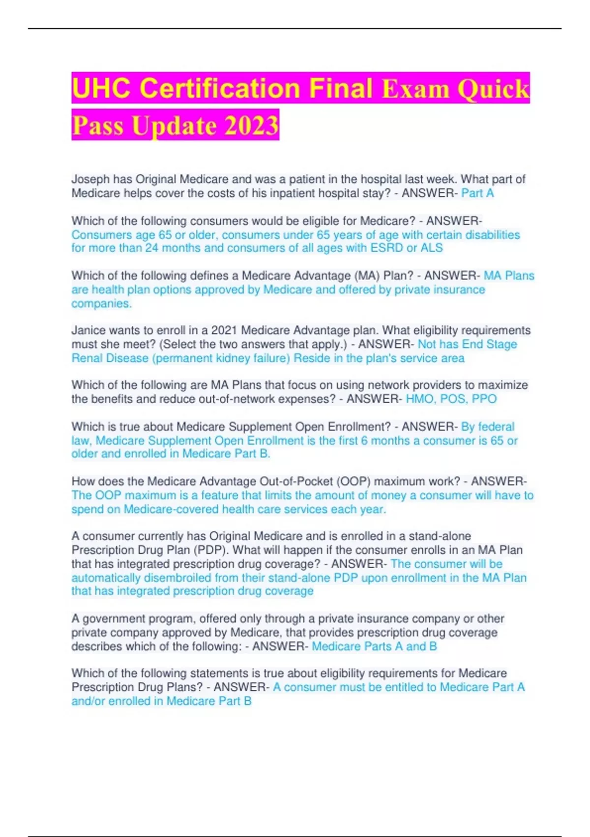 UHC Certification Final Exam Quick Pass Update 2023 Joseph has Original Medicare and was a patient in the hospital last week. What part of Medicare helps cover the costs of his inpatient hospital stay? - ANSWER- Part A Which of the following consumers would be eligible for Medicare? - ANSWERConsumers age 65 or older, consumers under 65 years of age with certain disabilities for more than 24 months and consumers of all ages with ESRD or ALS Which of the following defines a Medicare Advantage (MA) Plan? - ANSWER- MA Plans are health plan options approved by Medicare and offered by private insurance companies. Janice wants to enroll in a 2021 Medicare Advantage plan. What eligibility requirements must she meet? (Select the two answers that apply.) - ANSWER- Not has End Stage Renal Disease (permanent kidney failure) Reside in the plan's service area Which of the following are MA Plans that focus on using network providers to maximize the benefits and reduce out-of-network expenses? - ANSWER- HMO, POS, PPO Which is true about Medicare Supplement Open Enrollment? - ANSWER- By federal law, Medicare Supplement Open Enrollment is the first 6 months a consumer is 65 or older and enrolled in Medicare Part B. How does the Medicare Advantage Out-of-Pocket (OOP) maximum work? - ANSWERThe OOP maximum is a feature that limits the amount of money a consumer will have to spend on Medicare-covered health care services each year. A consumer currently has Original Medicare and is enrolled in a stand-alone Prescription Drug Plan (PDP). What will happen if the consumer enrolls in an MA Plan that has integrated prescription drug coverage? - ANSWER- The consumer will be automatically disembroiled from their stand-alone PDP upon enrollment in the MA Plan that has integrated prescription drug coverage A government program, offered only through a private insurance company or other private company approved by Medicare, that provides prescription drug coverage describes which of the following: - ANSWER- Medicare Parts A and B Which of the following statements is true about eligibility requirements for Medicare Prescription Drug Plans? - ANSWER- A consumer must be entitled to Medicare Part A and/or enrolled in Medicare Part B Which of the following statements is not true about the Coverage Gap? - ANSWER- All members reach the Coverage Gap Which of the following best describes the Late Enrollment Penalty (LEP)? - ANSWERThe amount added to the member's monthly plan premium if they did not enroll in a Medicare Advantage plan with Part D benefits or stand-alone prescription drug plan when they were first eligible for Medicare Parts A and/or B or went without creditable prescription drug coverage for 63 continuous days or more. Through which means is financial assistance offered to a consumer who qualifies for Low Income Subsidy for their part of Medicare Part D costs? - ANSWER- Through subsidies such as lower or no monthly plan premiums and lower or no copayments Medications that are covered in a Plan's formulary have various levels of associated member cost-sharing (copayments or coinsurance). What are these drug levels called? - ANSWER- Drug tiers In states where Medicare Supplement Insurance underwriting criteria can apply, all of the following underwriting criteria apply EXCEPT: - ANSWER- Consumers may be underwritten to determine their acceptance and, if applicable, their rate. The new MACRA legislation, which went into effect January 1, 2020, applies to all carriers offering Medicare supplement plans. - ANSWER- TRUE Which of the following is NOT true of Medicare Supplement Insurance Plans? - ANSWER- Plan benefit amounts automatically update when Medicare changes cost sharing amounts, such as deductibles, coinsurance and copayments. NOT Which definition best describes Medicare Part A? The part of Medicare that is a voluntary program offered by private insurance companies that provides prescription drug coverage for an additional monthly premium. The part of Medicare that offers combined medical and prescription drug coverage. The part of Medicare that helps with the cost of inpatient hospital stays. It also helps with hospice care and some skilled care for the homebound. The part of Medicare that helps with the cost of medically necessary doctor visits and other medical services, including outpatient care at hospitals and clinics, laboratory tests, some diagnostic screenings. - ANSWER- The part of Medicare that helps with the cost of inpatient hospital stays. It also helps with hospice care and some skilled care for the homebound. Which statement is true about a member of a Medicare Advantage (MA) Plan who wants to enroll in a Medicare Supplement Insurance Plan? When a consumer enrolls in a Medicare Supplement Insurance Plan, he/she is automatically disembroiled from his/her MA Plan. A member does not need a valid election period to disenrollment from an MA plan. When a consumer enrolls in a Medicare Supplement Insurance Plan, he/she is not automatically disembroiled from his/her MA Plan. A consumer can use a Medicare Supplement Insurance Plan and an MA Plan at the same time. - ANSWER- When a consumer enrolls in a Medicare Supplement Insurance Plan, he/she is automatically disembroiled from his/her MA Plan. Being 65 or older, being less than 65 years of age with certain disabilities for more than 24 months, and being any age with ESRD or ALS are each eligibility requirements for which program? Medicaid Original Medicare Low Income Subsidy - ANSWER- Original Medicare To be eligible for this plan type, consumers must meet the following requirements:- Entitled to Medicare Part A and enrolled in Part B- Reside in the plan's service area Which plan is being described? Medicare Advantage Prescription Drug Medicaid Original Medicare - ANSWER- Medicare Advantage What must be explained to consumers enrolling in an HMO (Health Maintenance Organization) MA Plan? (Select 3) They must see contracted network providers in order to 